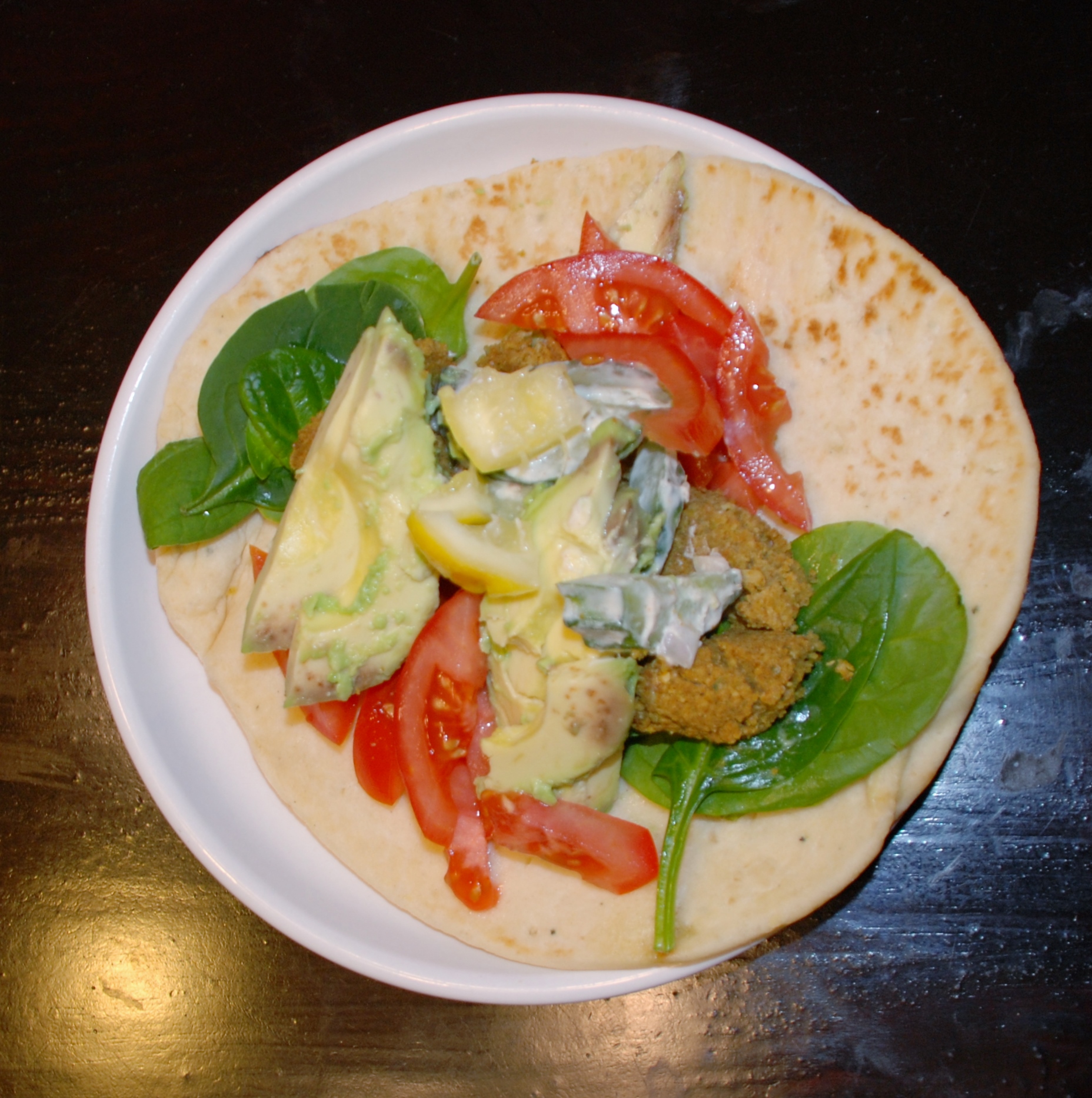 Compile: Take Falafel and the Naan out of the oven. Place pitas on each plate toped with falafel patties, spinach, tomatoes, cucumber yogurt, splash of lemon.