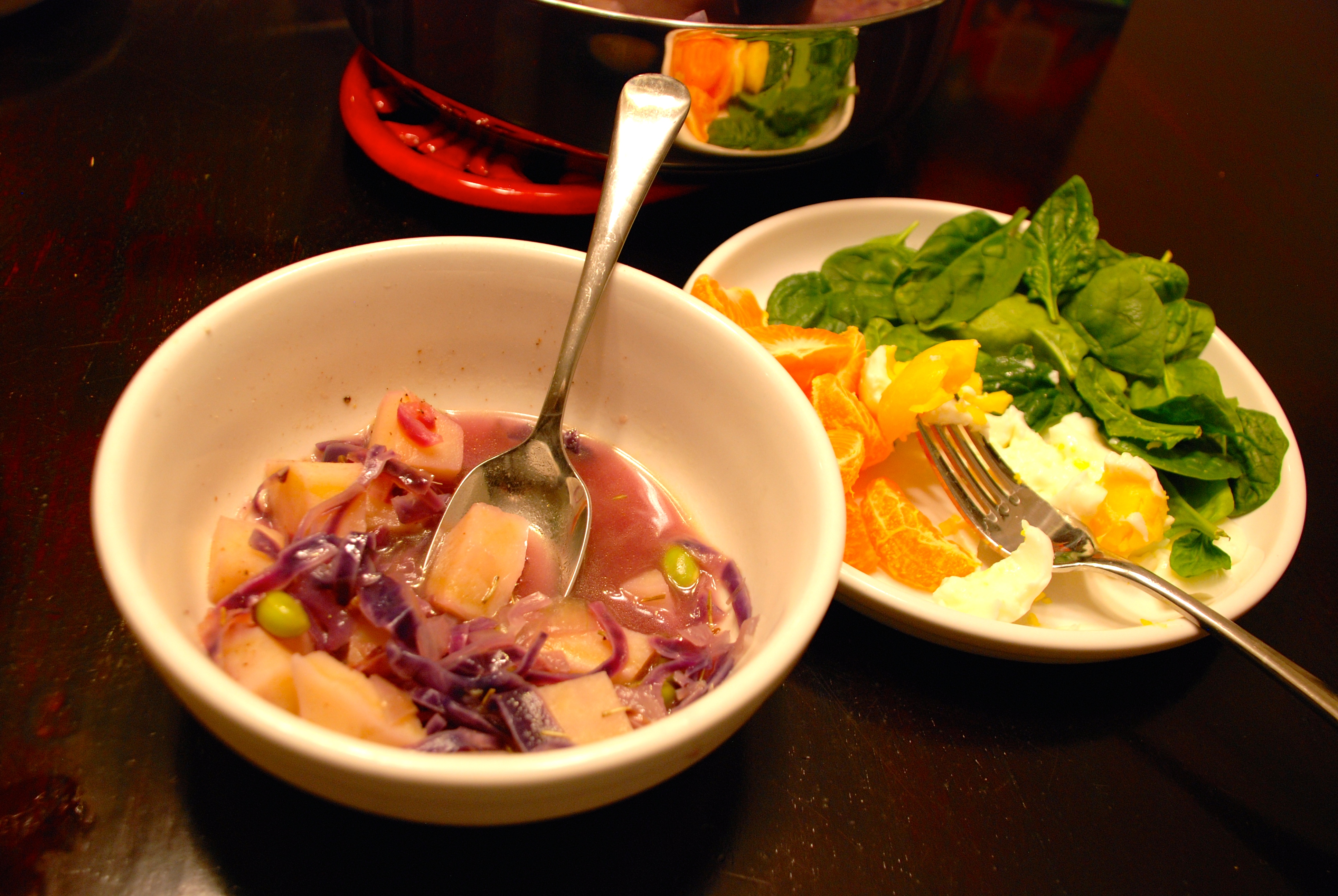 I pause, and reply, “What do you mean?” “I mean why does your plate look just so pretty?” he says. And I burst out laughing! He is right! I’ve strategically arranged my food and spoon and bowl just so. I’ve styled it up as much as I can style a meal at this point. That’s why mine looks so “pretty”. Cause I am going to blog about it. And I hadn’t yet served them any eggs or oranges or spinach salad. They just each had a bowl of purplish soup in front of them.