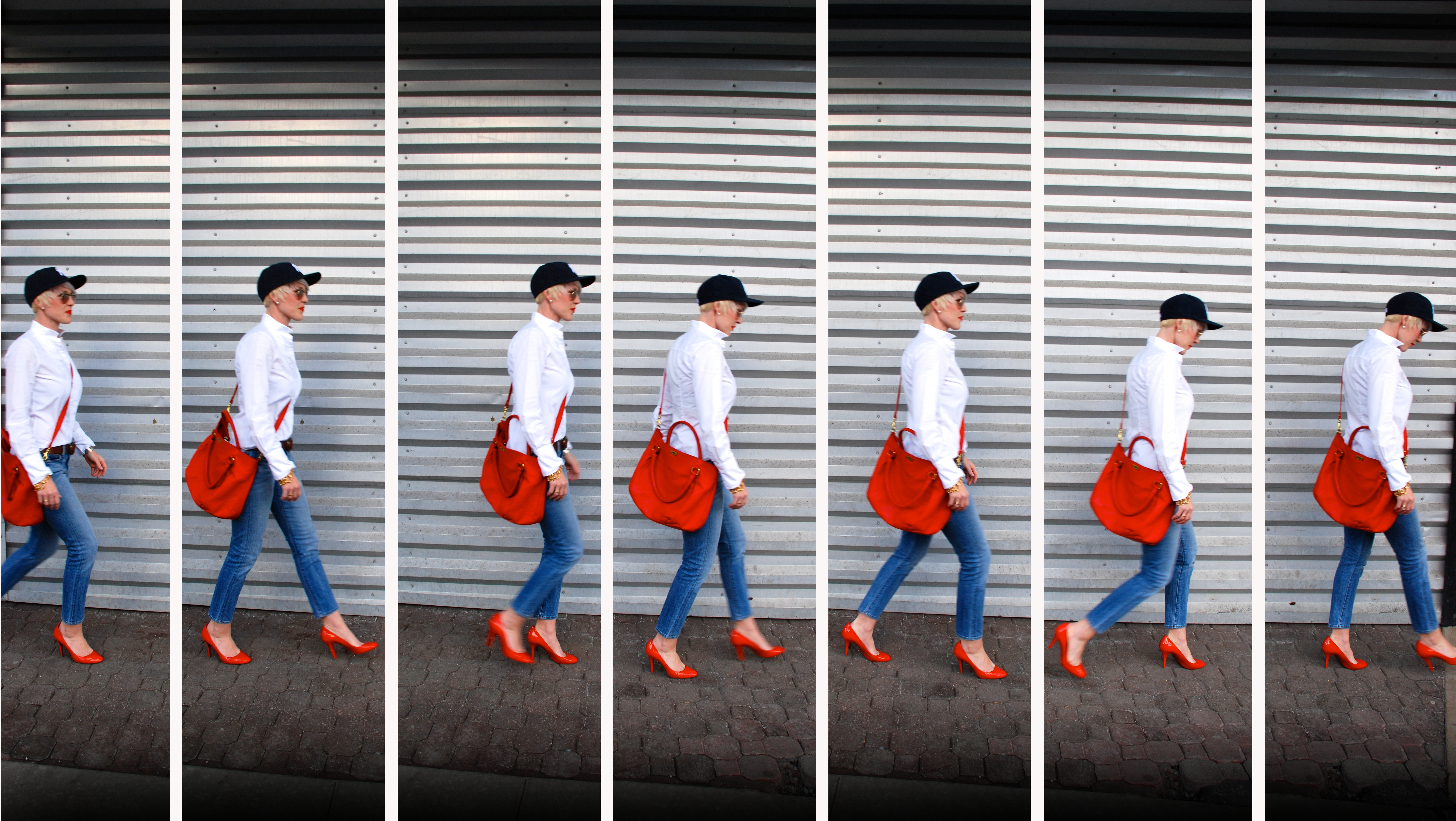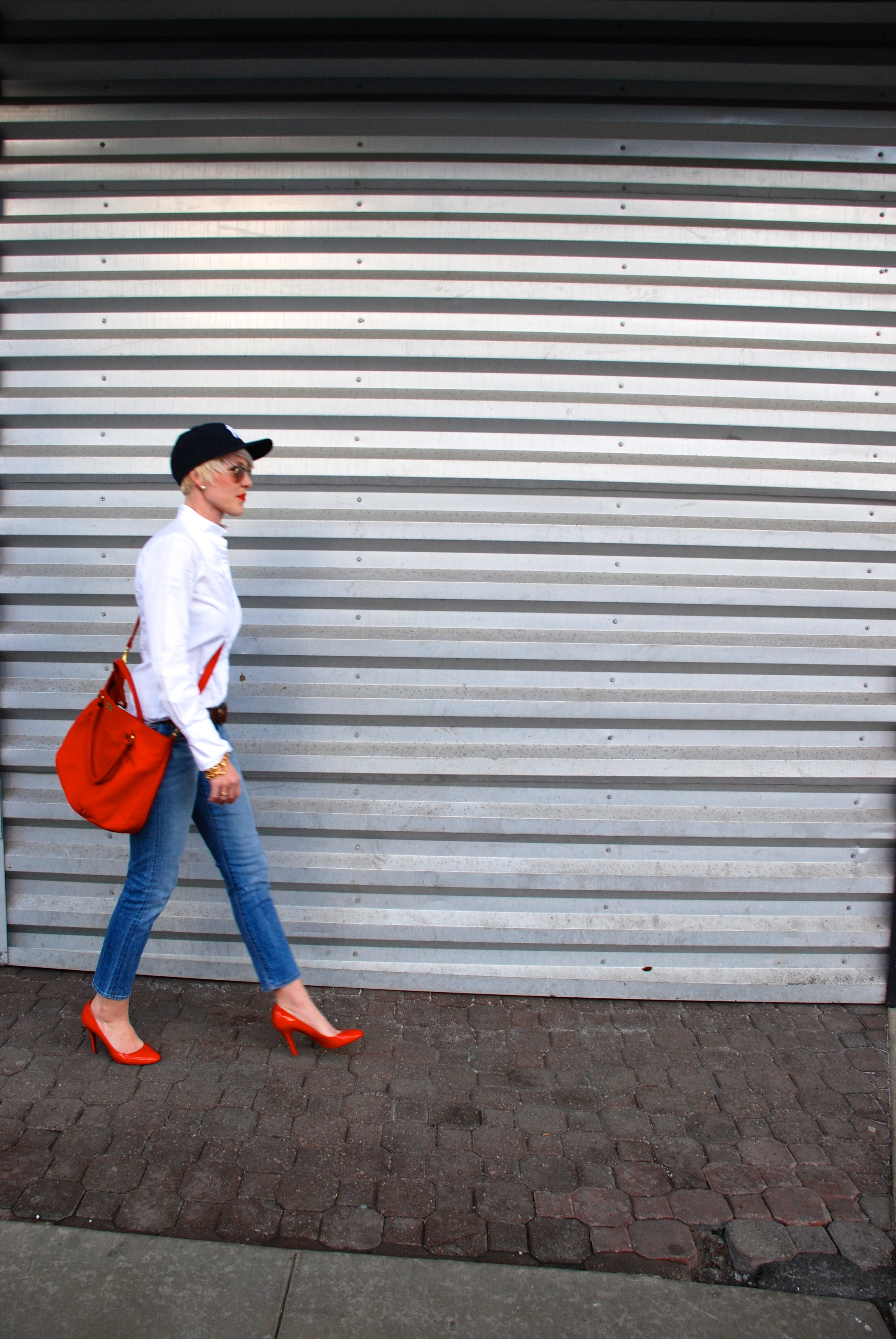 This look is caught squarely in the middle. Dressy with those juicy red heels and bright lip. Casual with the cap and cross-body bag. The bright red lip is a must whether you really are headed out to a baseball game in your converse or just home doing the dishes in your slippers. Try it next time you get lost in a load of plates, bowls, cups, and cutlery. Swipe on a red lip and just see if it makes you feel better!