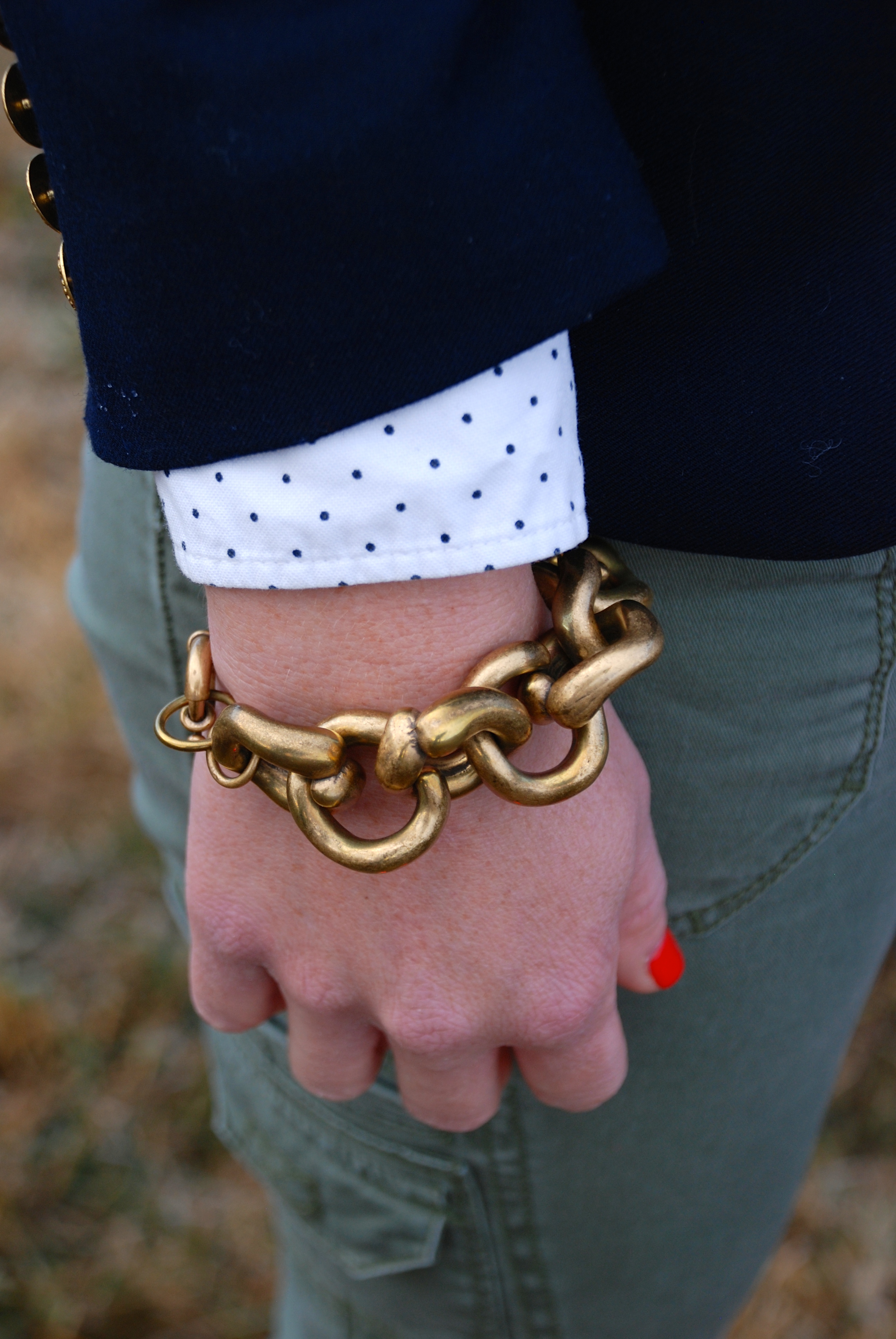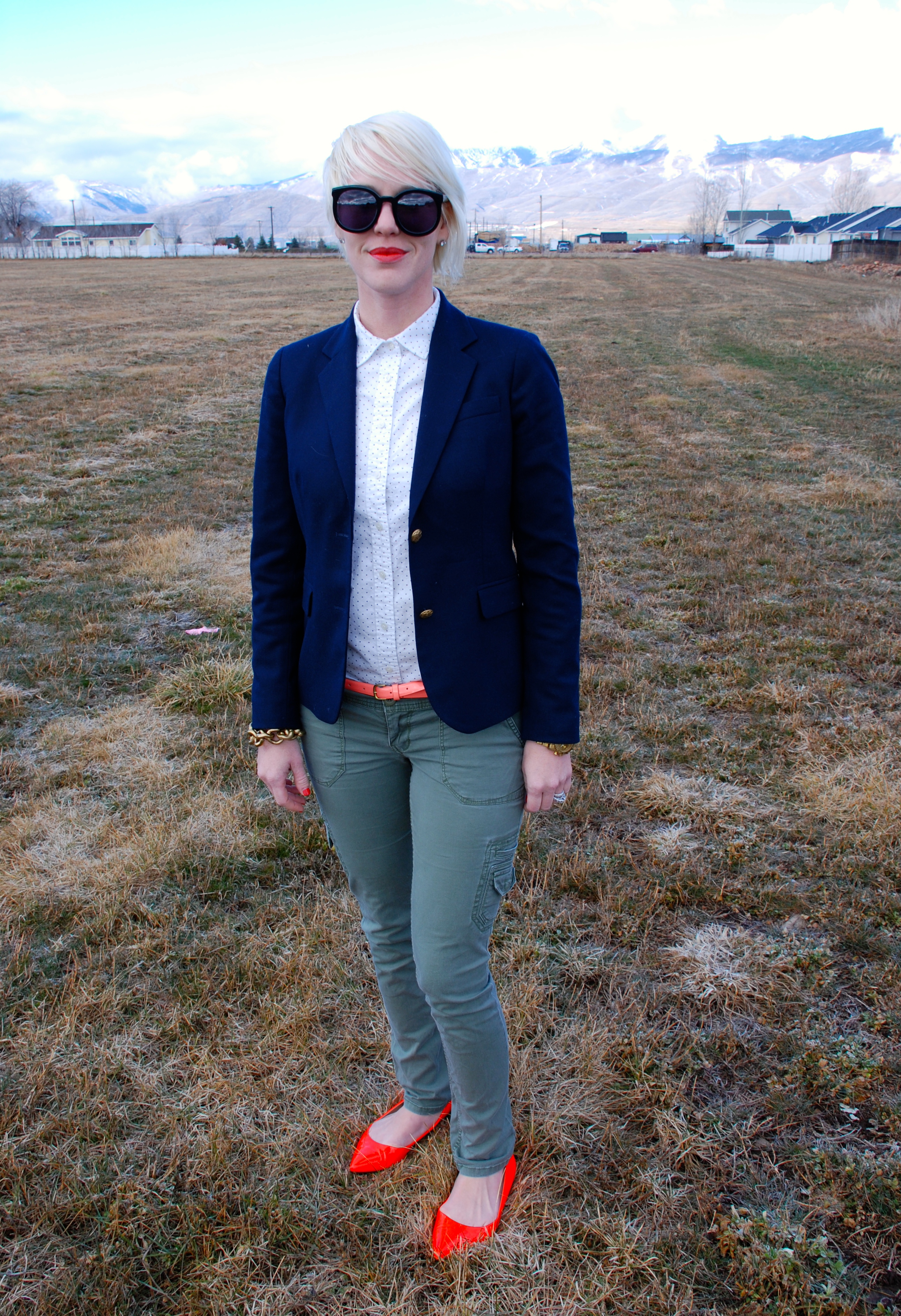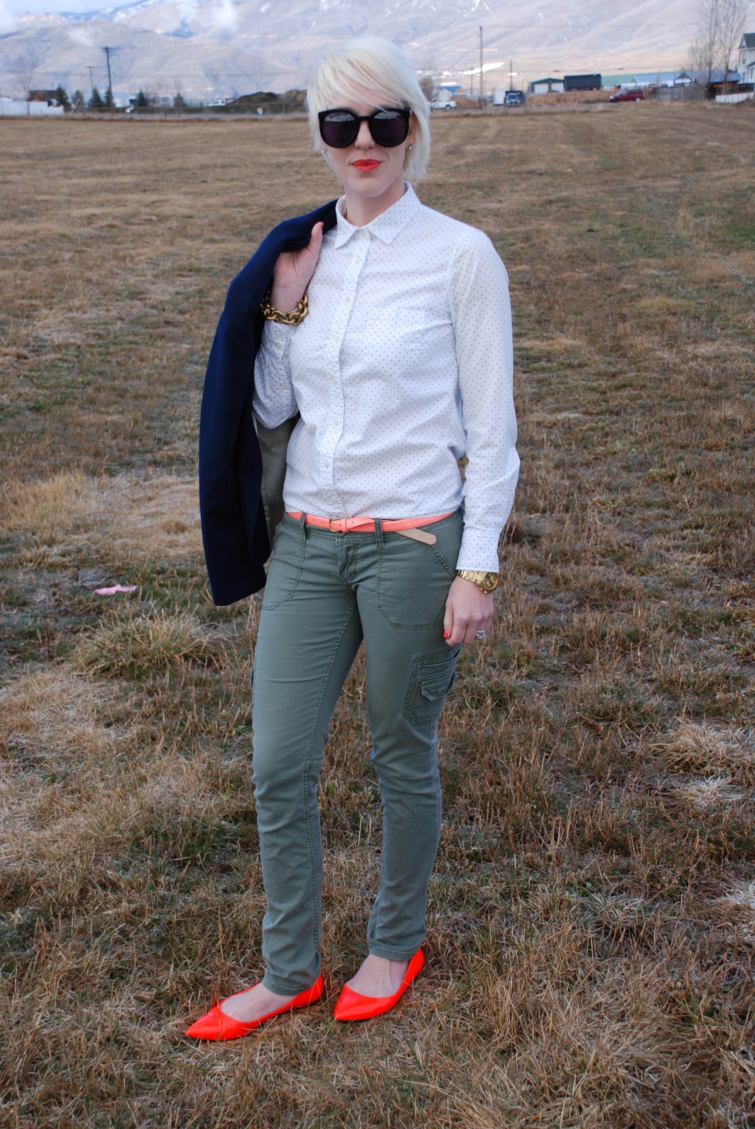 Most of the elements of this outfit are classics– blazer, pointy toe flats, pin-dot button down. The edge comes in the unexpected– the neon orange of the shoe, the blazer paired with utility pants, the shirt buttoned up to the tip top, chunky accessories– just the right amount of fun if you ask me.