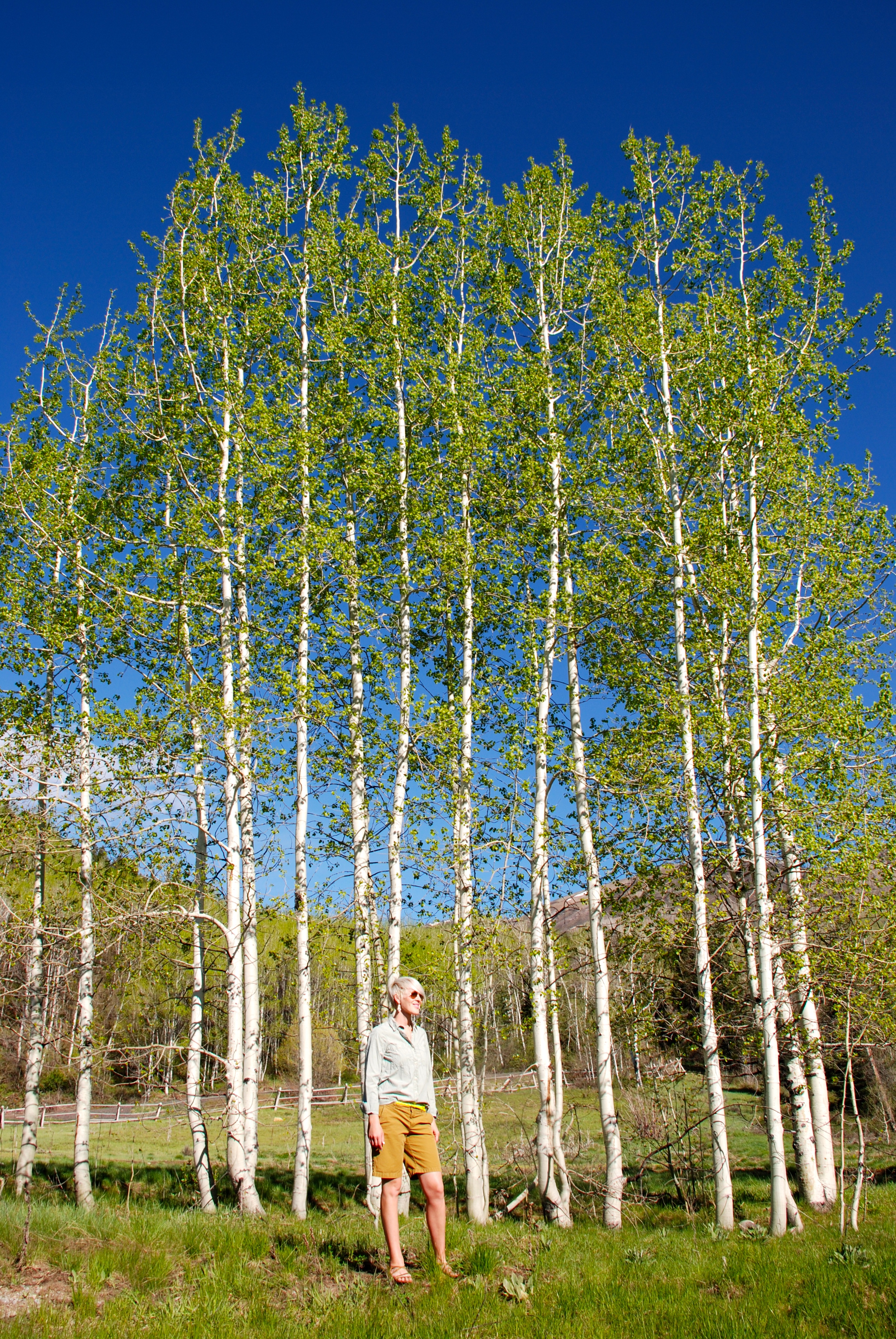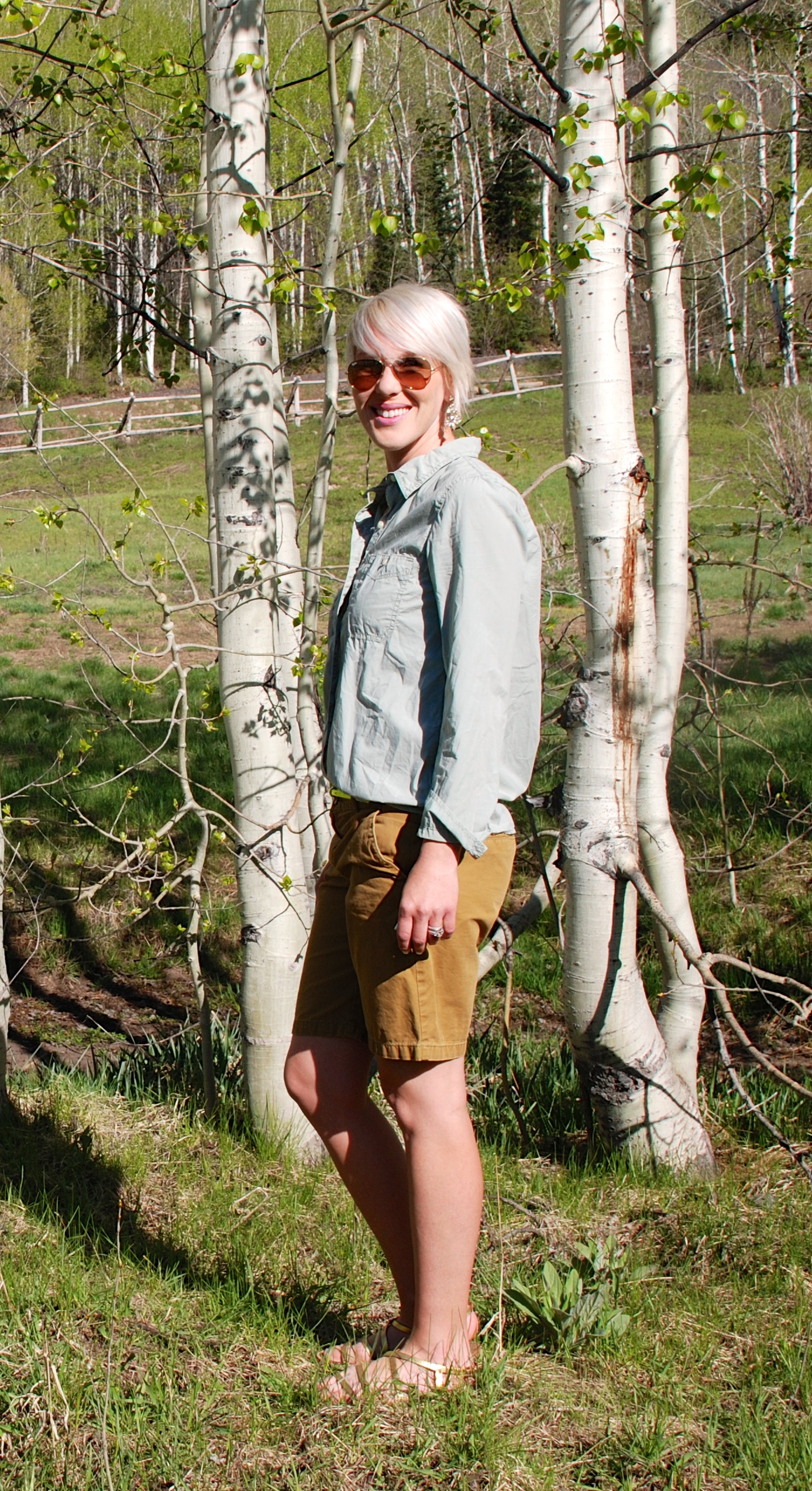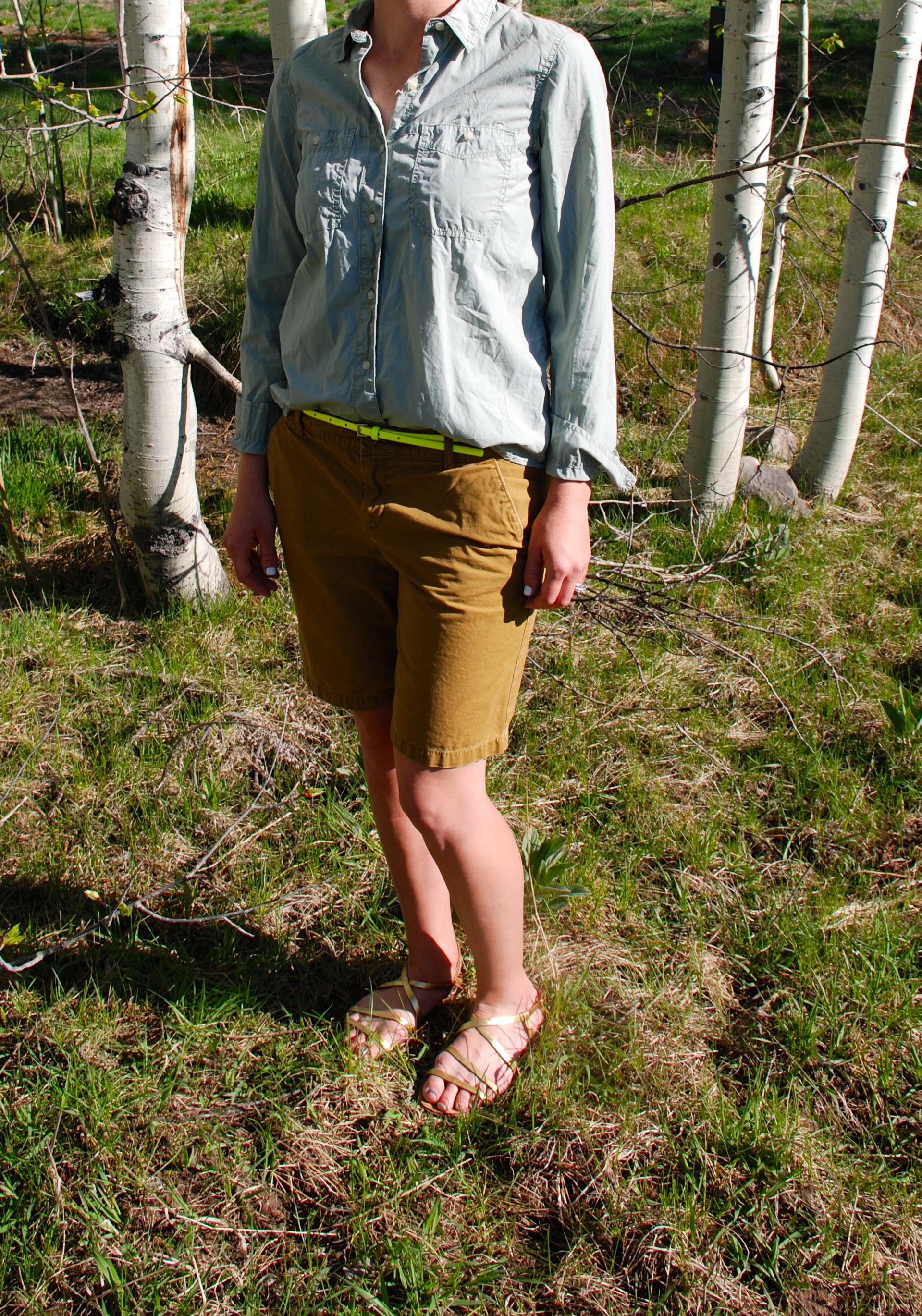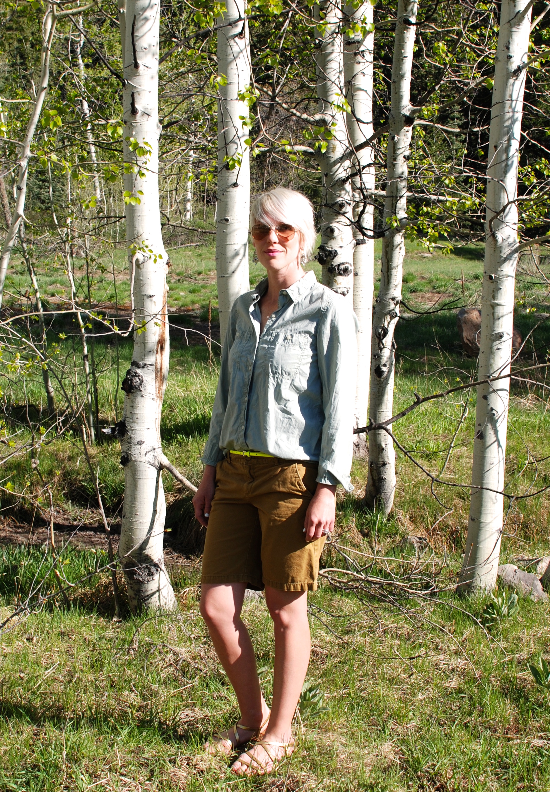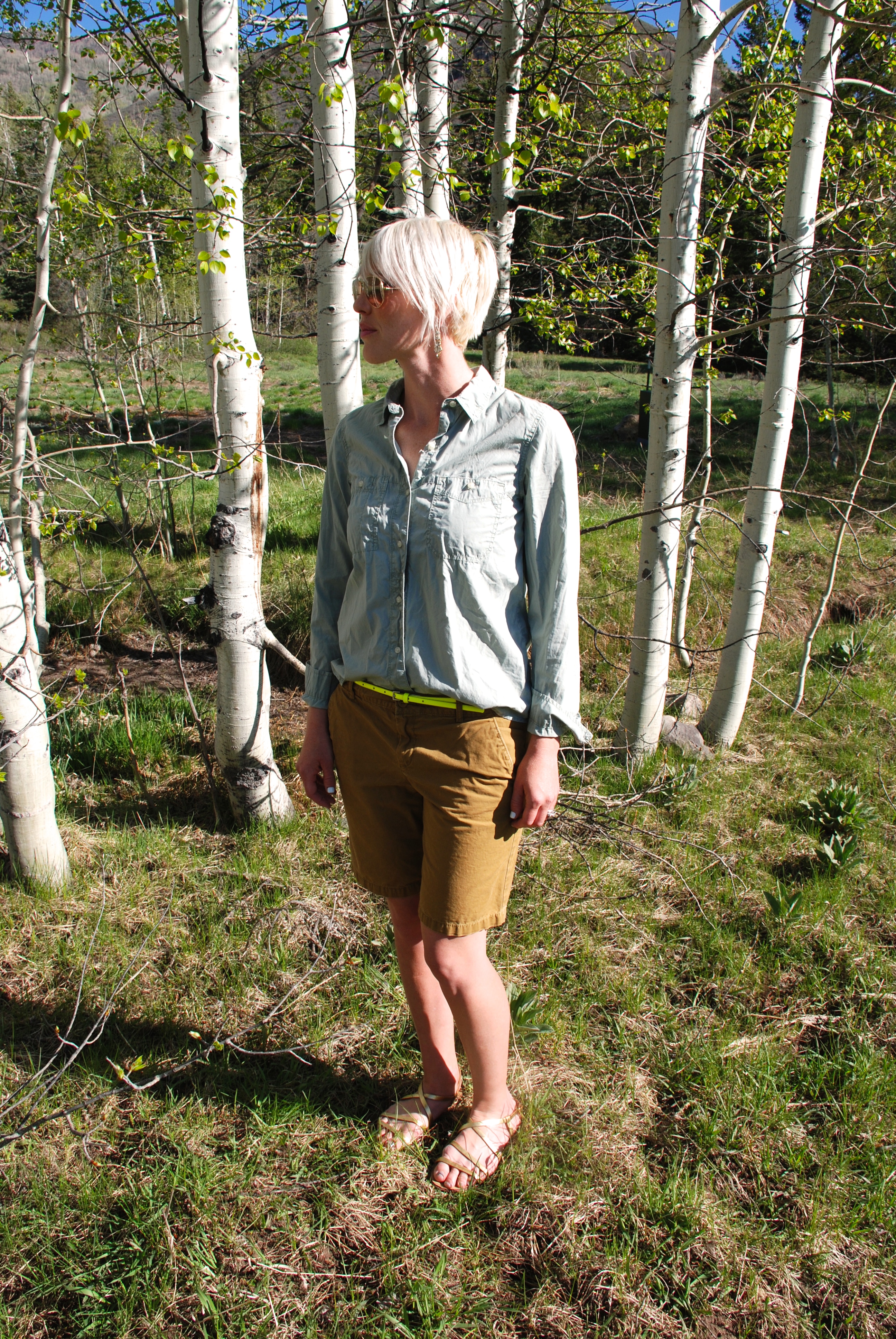 The green of the grass, the deep azure of the sky, in contrast to the rich white stand of the aspen. WOW! It’s easy for me to start to view neutrals as only whites, grays, and browns. But green and ochre are great options too! Had to add a little extra with the neon belt, and wish I were carrying around this adorable little cross-body bag to accent this outfit as well.