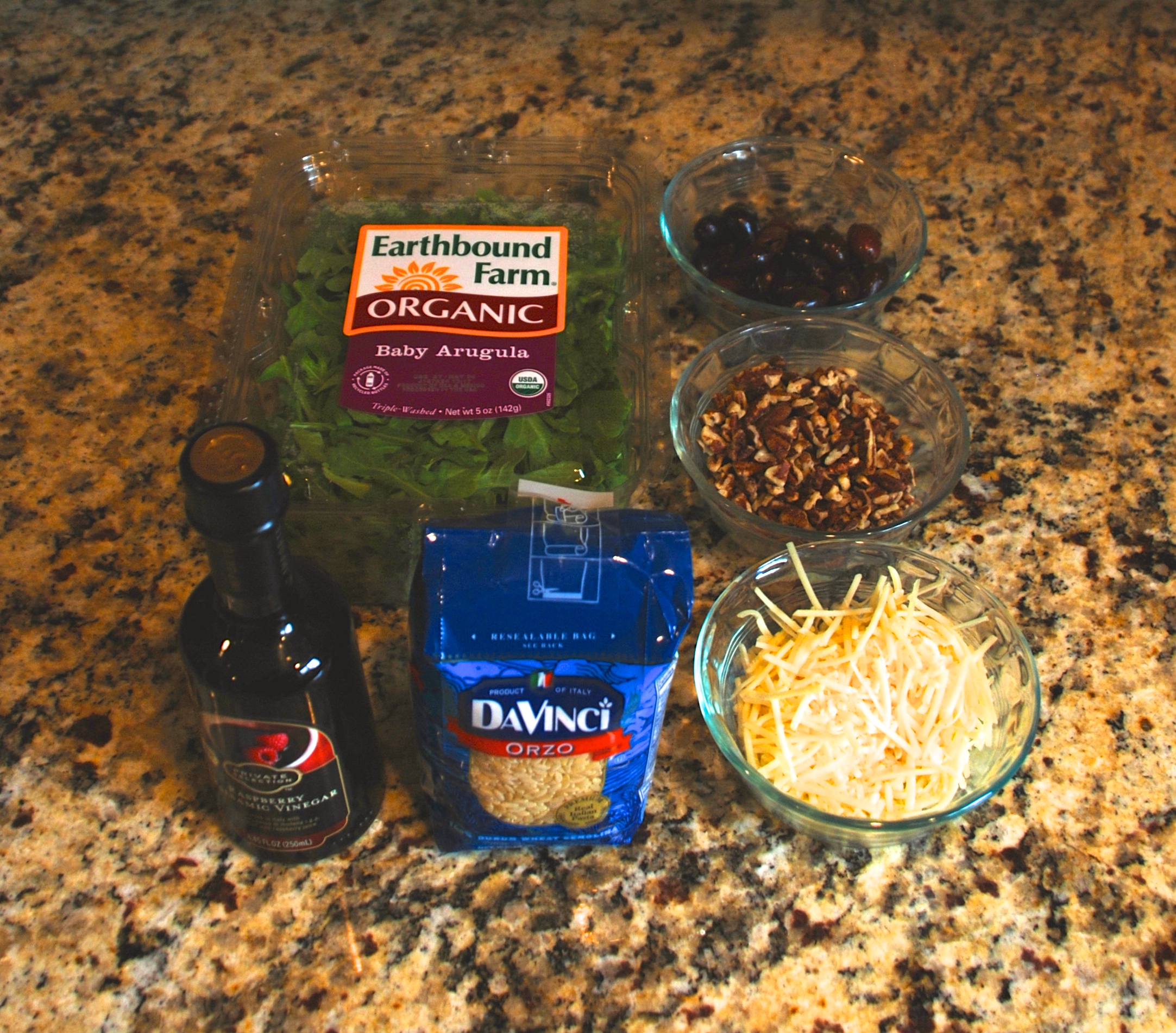 First, start the orzo boiling in salted water, cook according to the package directions. Meanwhile, heat a small skillet and toast the walnuts/pecans for 3-5 minutes, stirring as they heat. While the nuts are toasting, you can mix the olive oil and the balsamic vinegar in a large measuring cup. Set aside. Slice the olives in thirds. In a large serving bowl, combined the arugula, olives, and walnuts/pecans (after they’ve cooled).