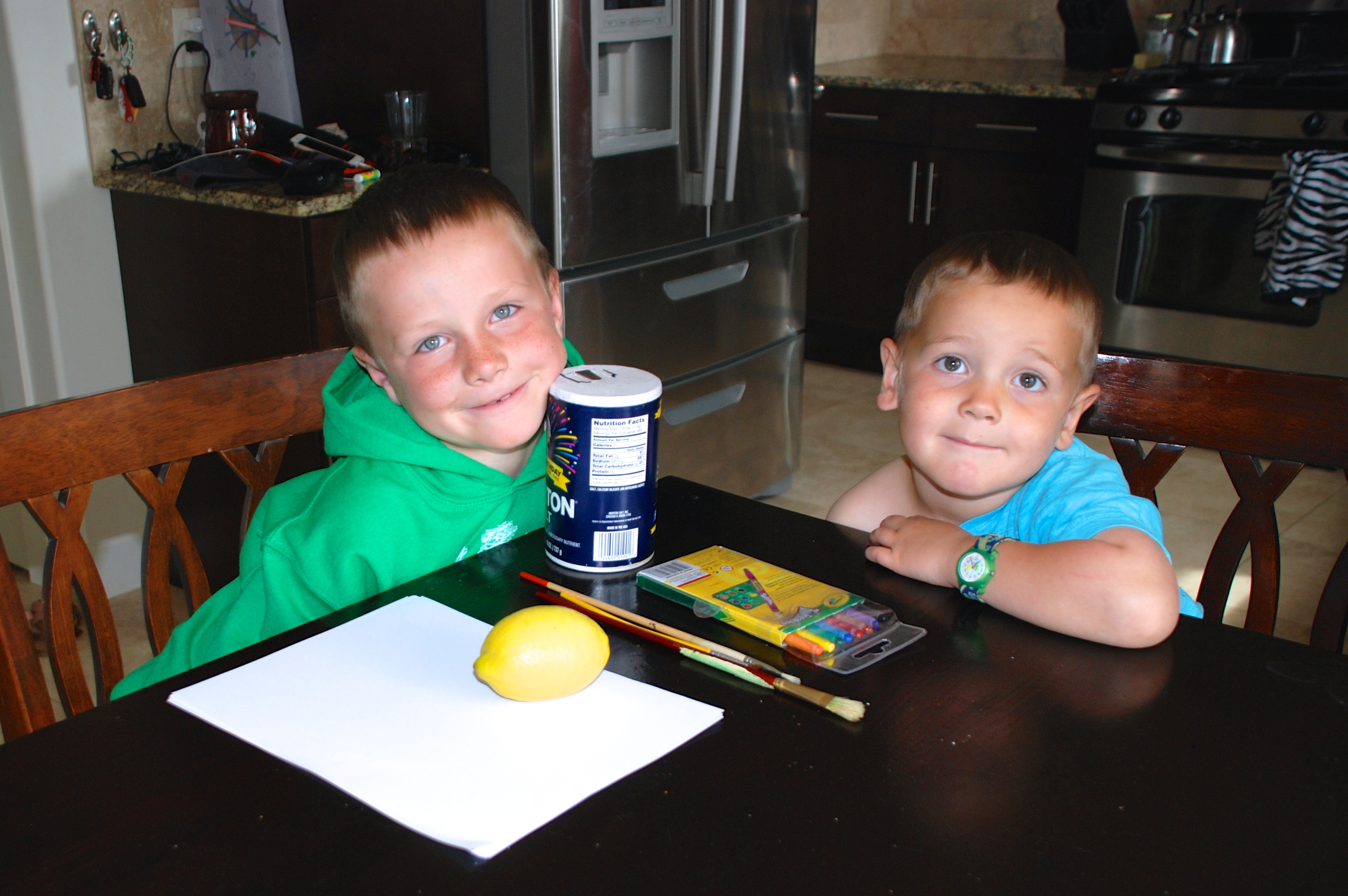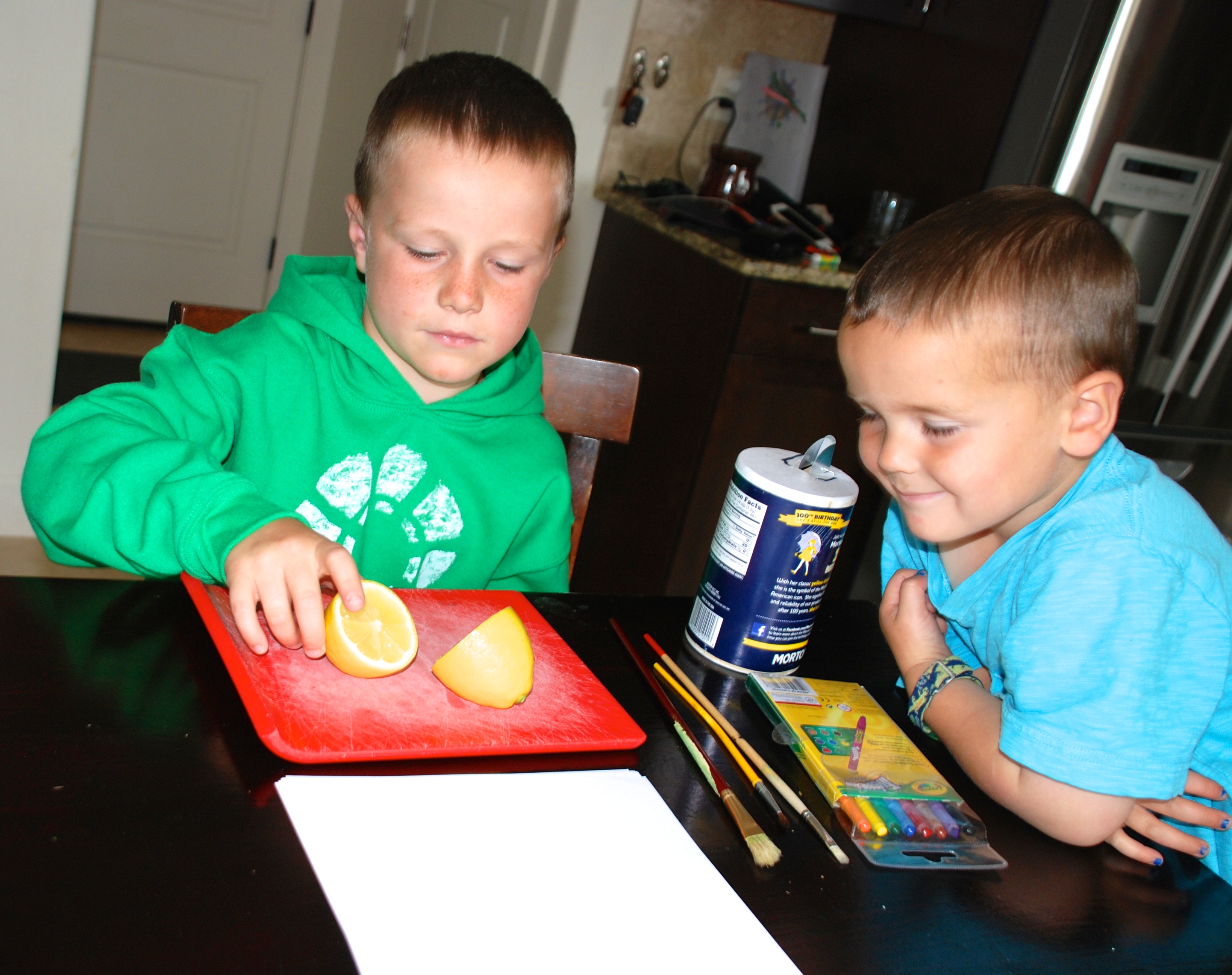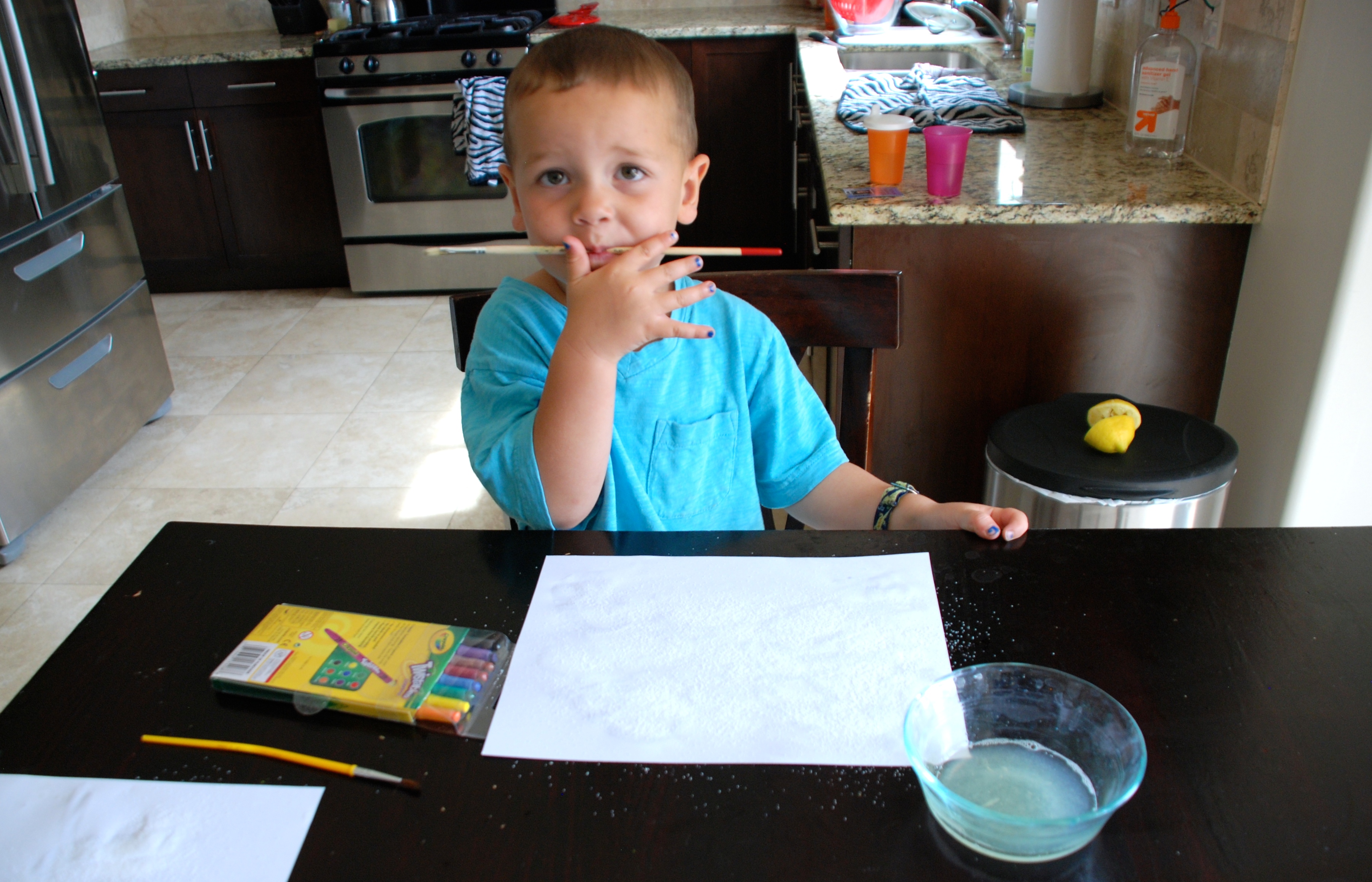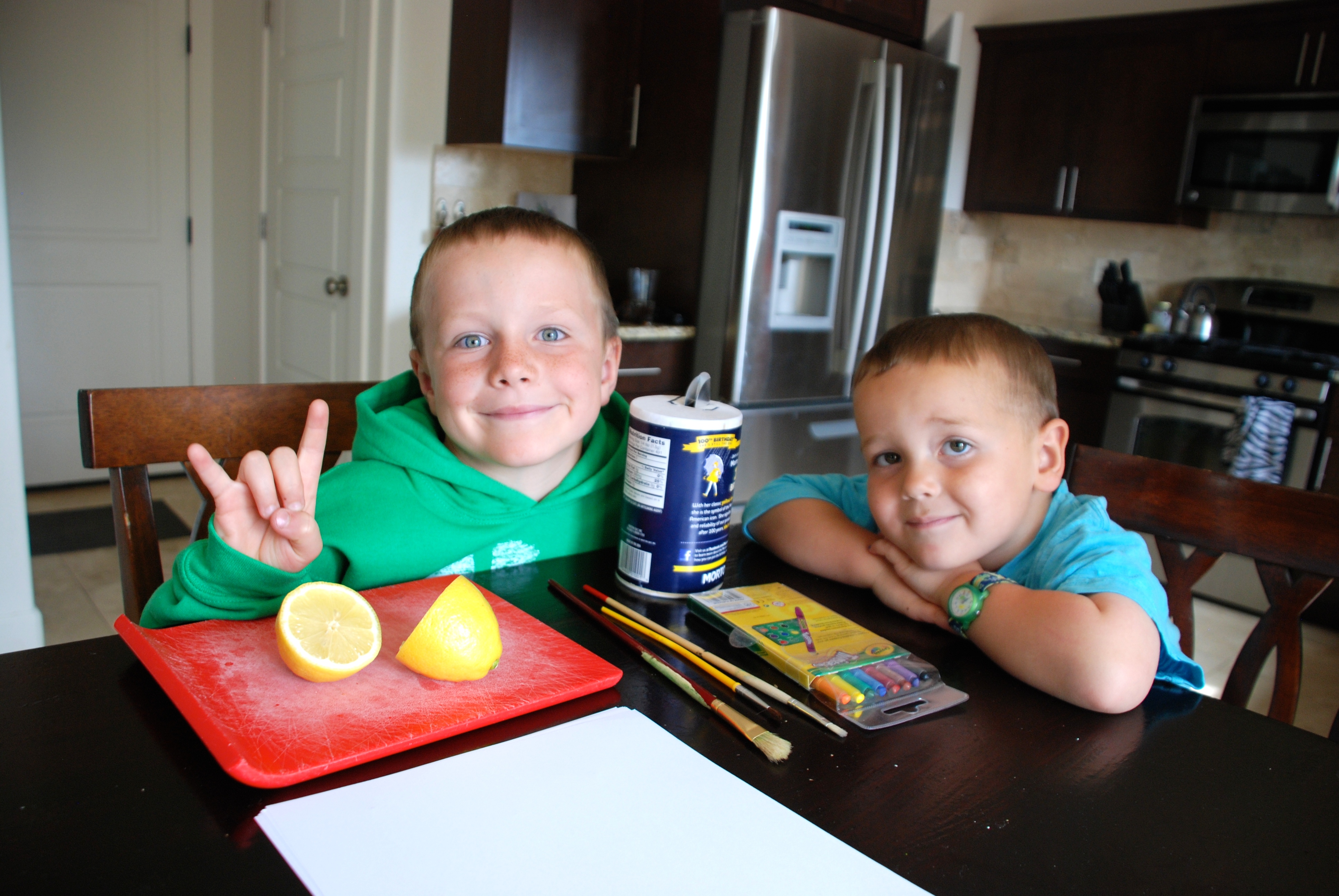 To begin, there are several recipes for invisible ink, here. Pick you poison. We went with straight lemon juice. Gather a lemon, salt, paint brushes, paper, crayons.