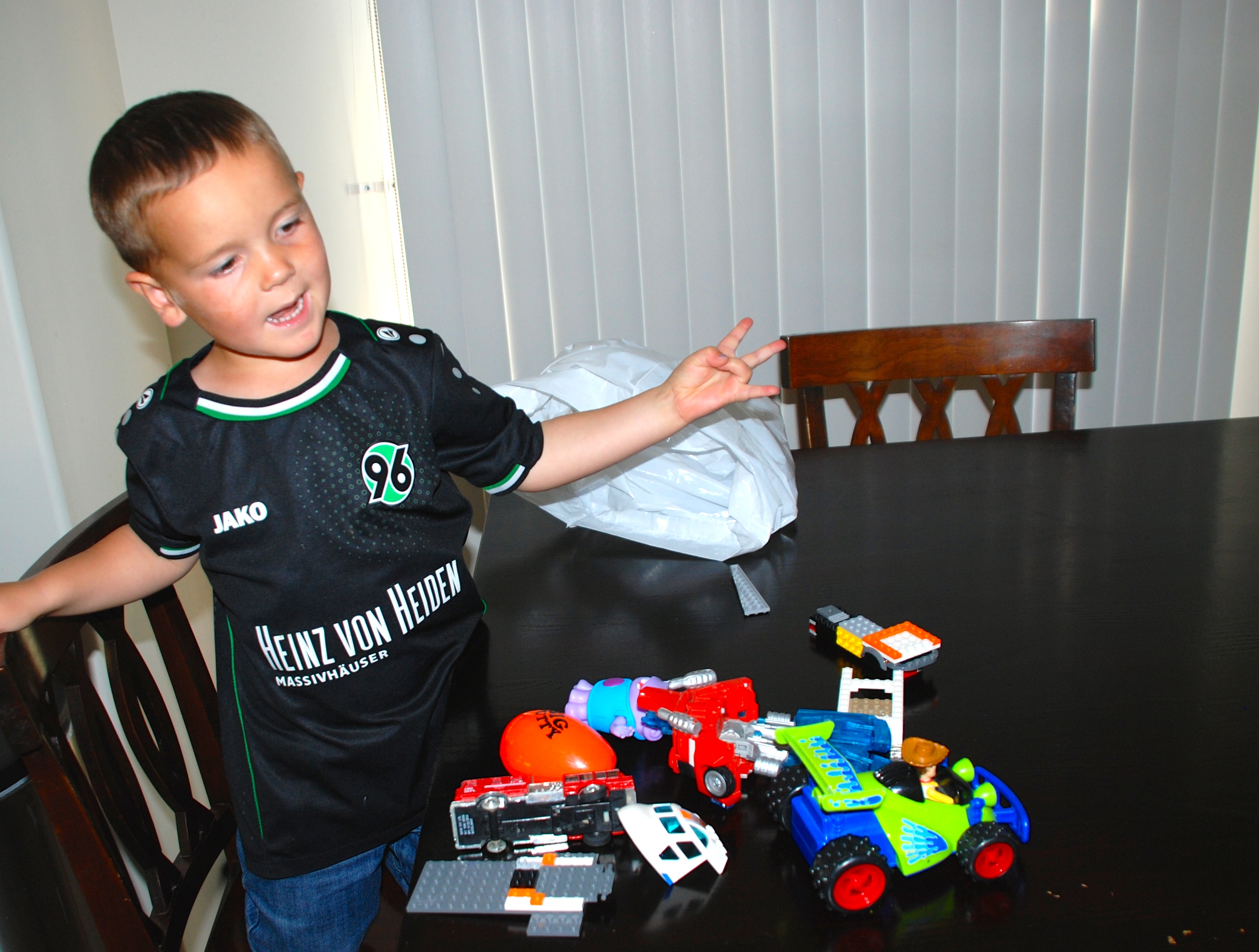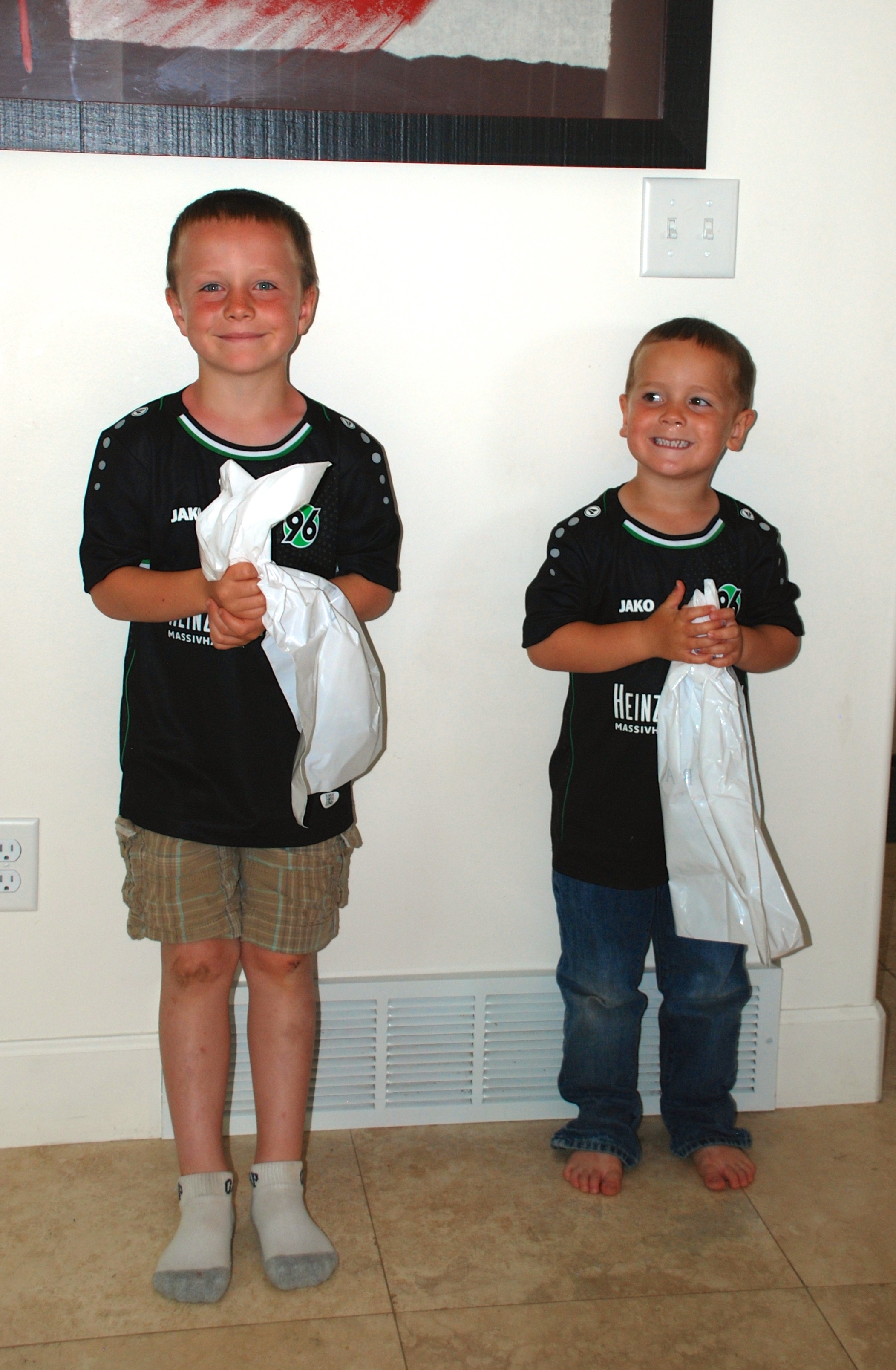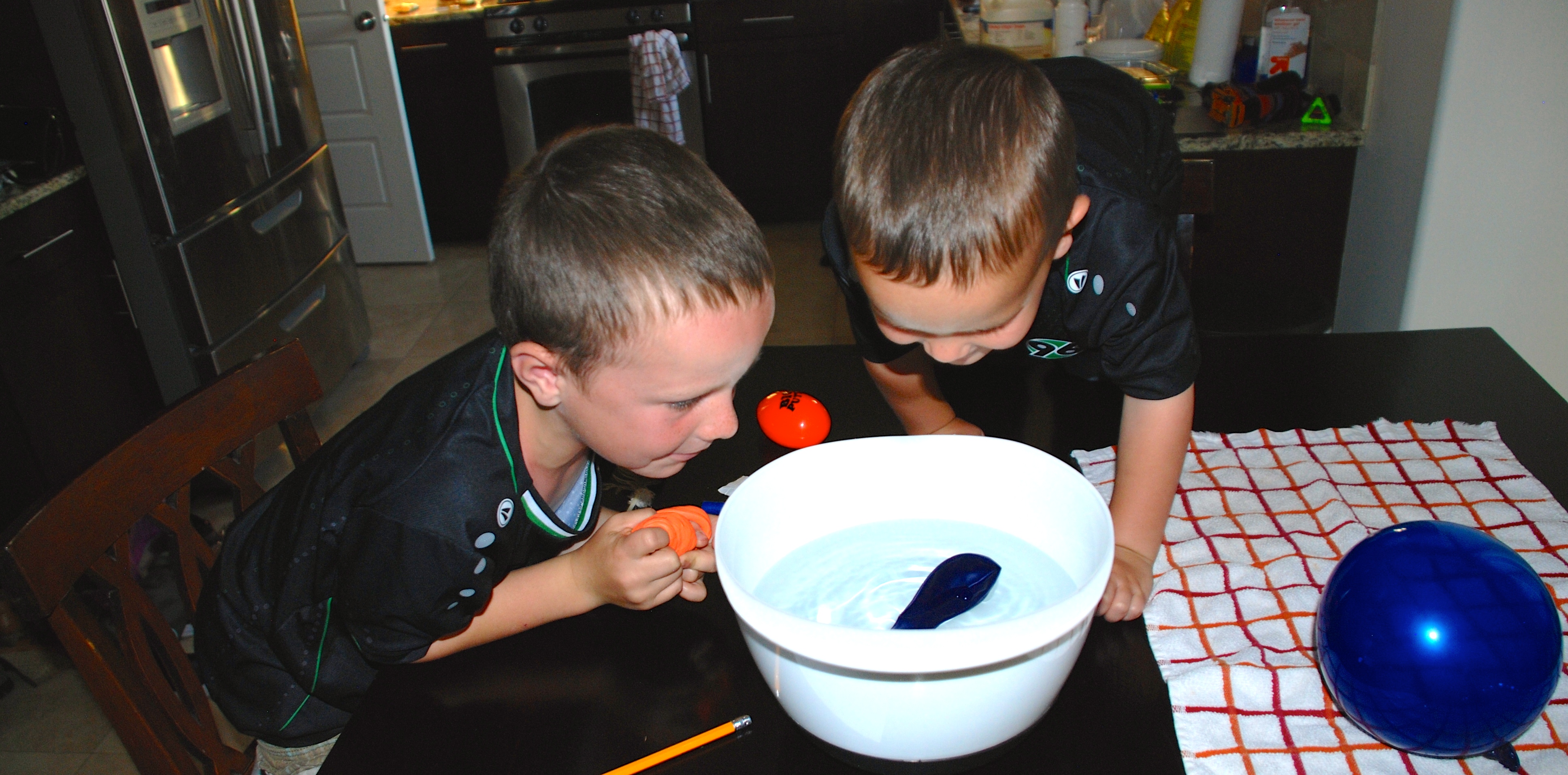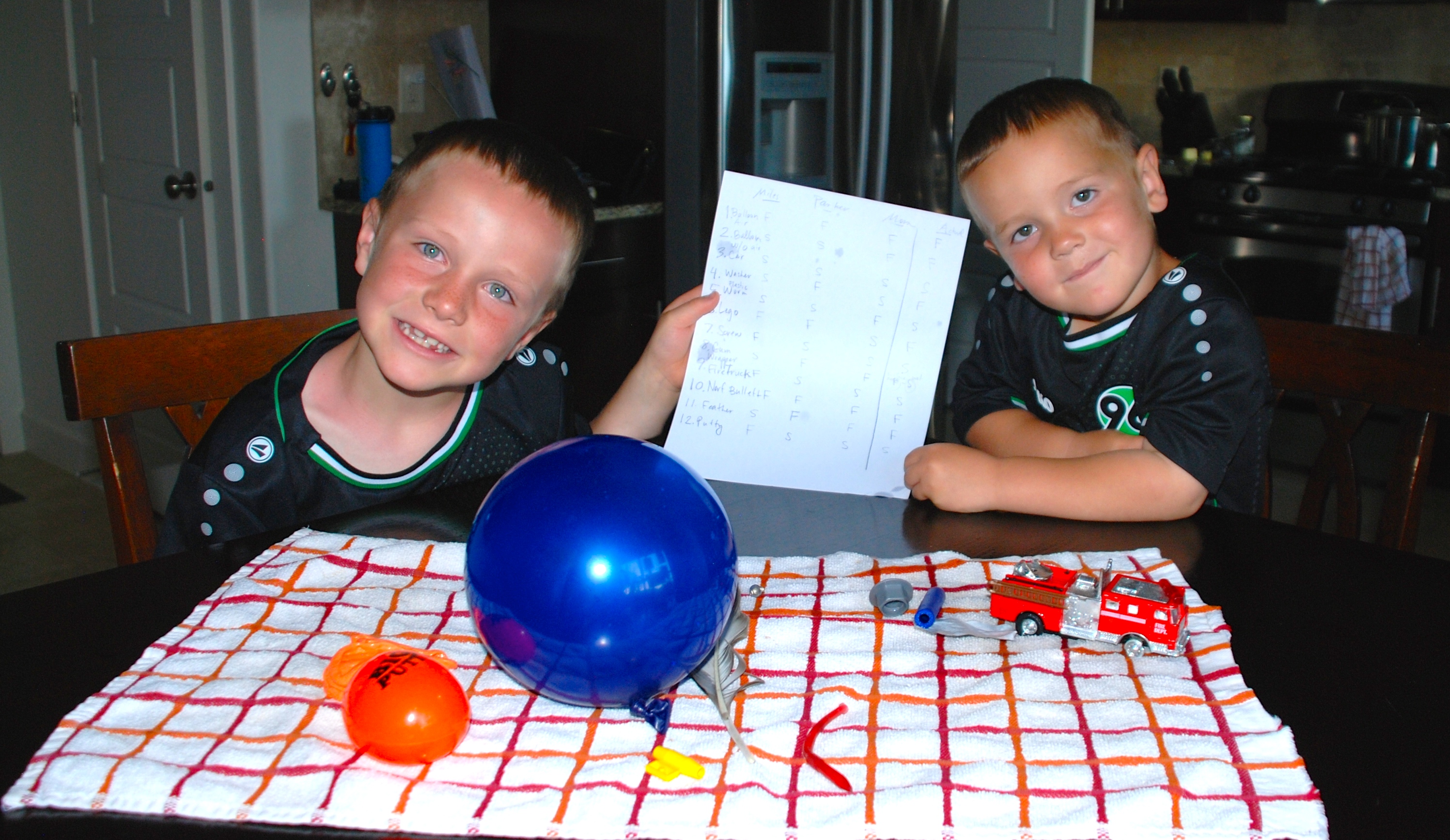 Those two smiling faces above are much more than garbage seekers. I gave the boys each a plastic bag, and asked them to go to their room and choose 5 things they thought would sink and five things they thought would float when placed in water. This didn’t take long and they returned with their loot. I did have to let them know that 10 legos each wouldn’t work as experiment fodder. So back to their rooms they went.