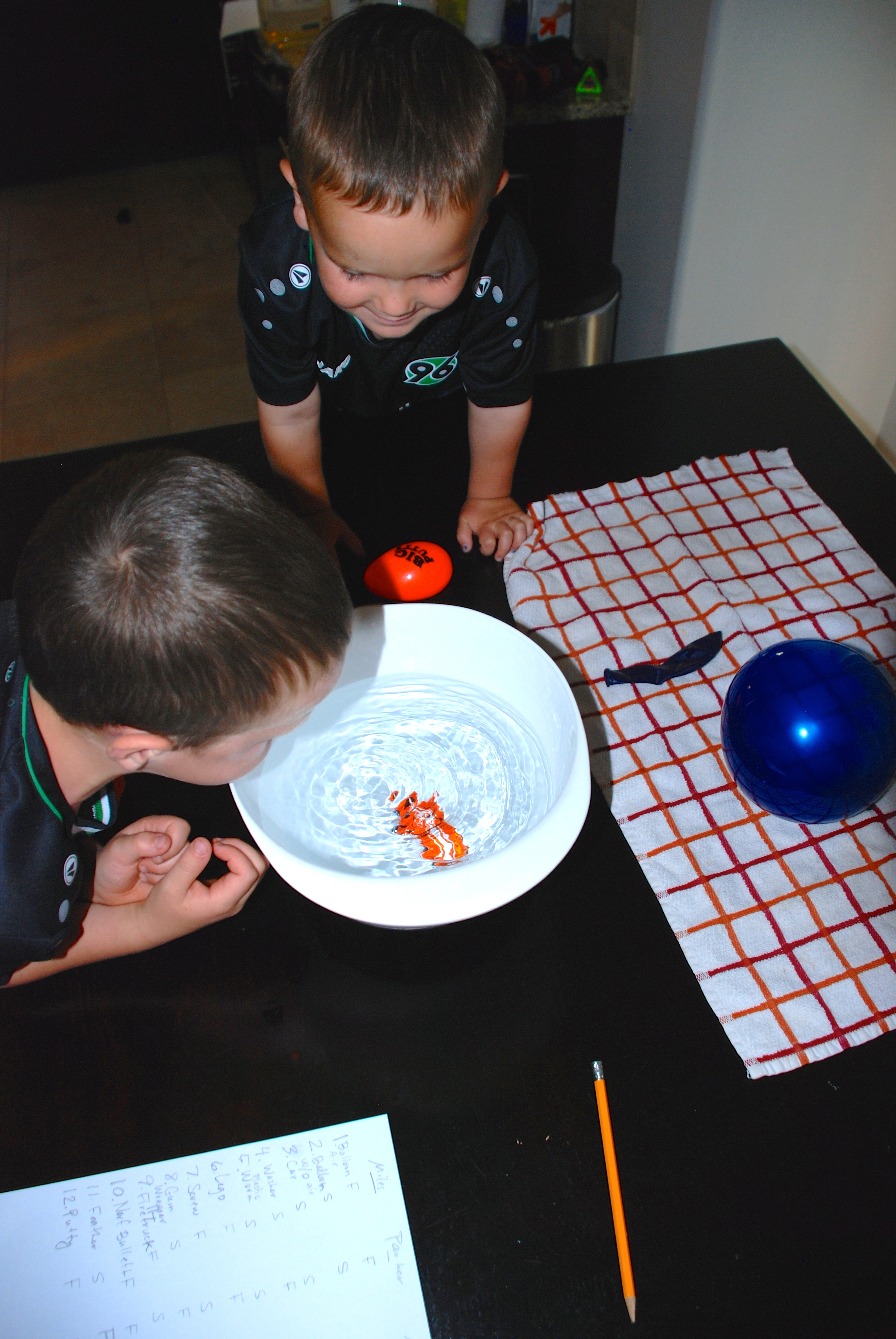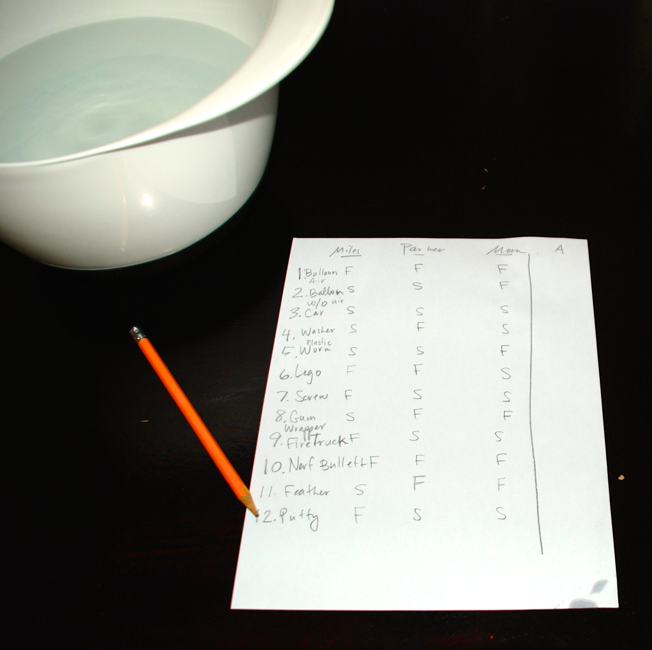 That was the question. We really shot from the hip on this one. We set out to find out if household items (read TOYS mostly 🙂 would float or sink when placed in water. Additionally, we decided that each of us would pre-guess the results for each item. You know, mini-hypothesis’.