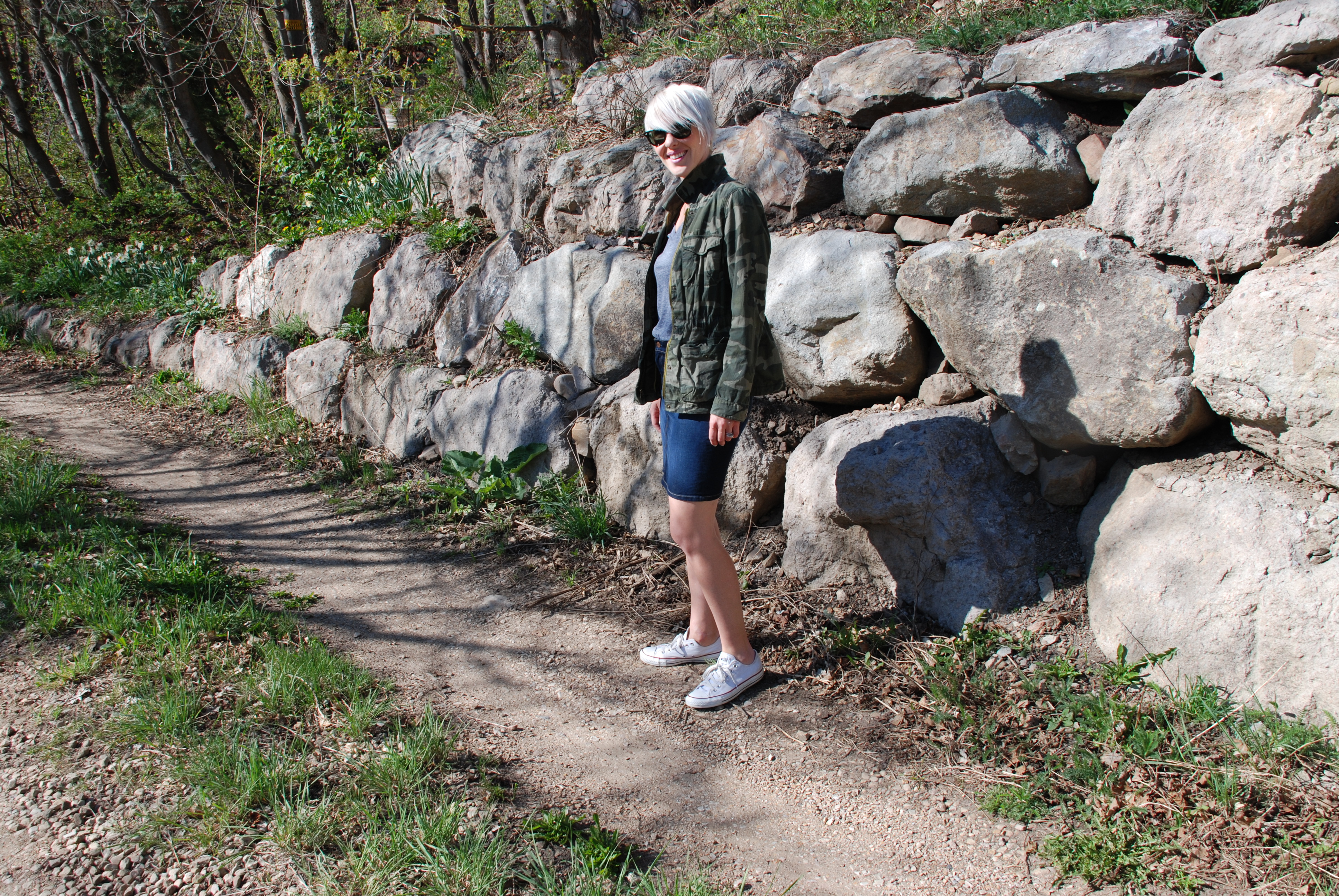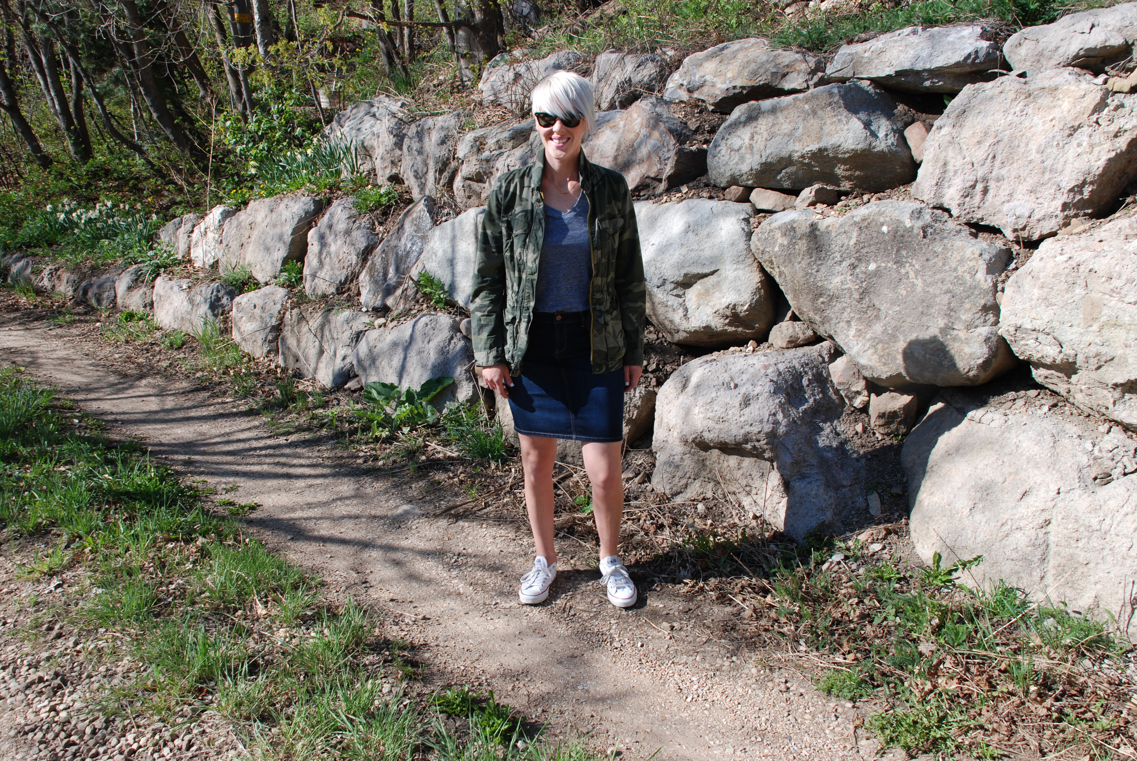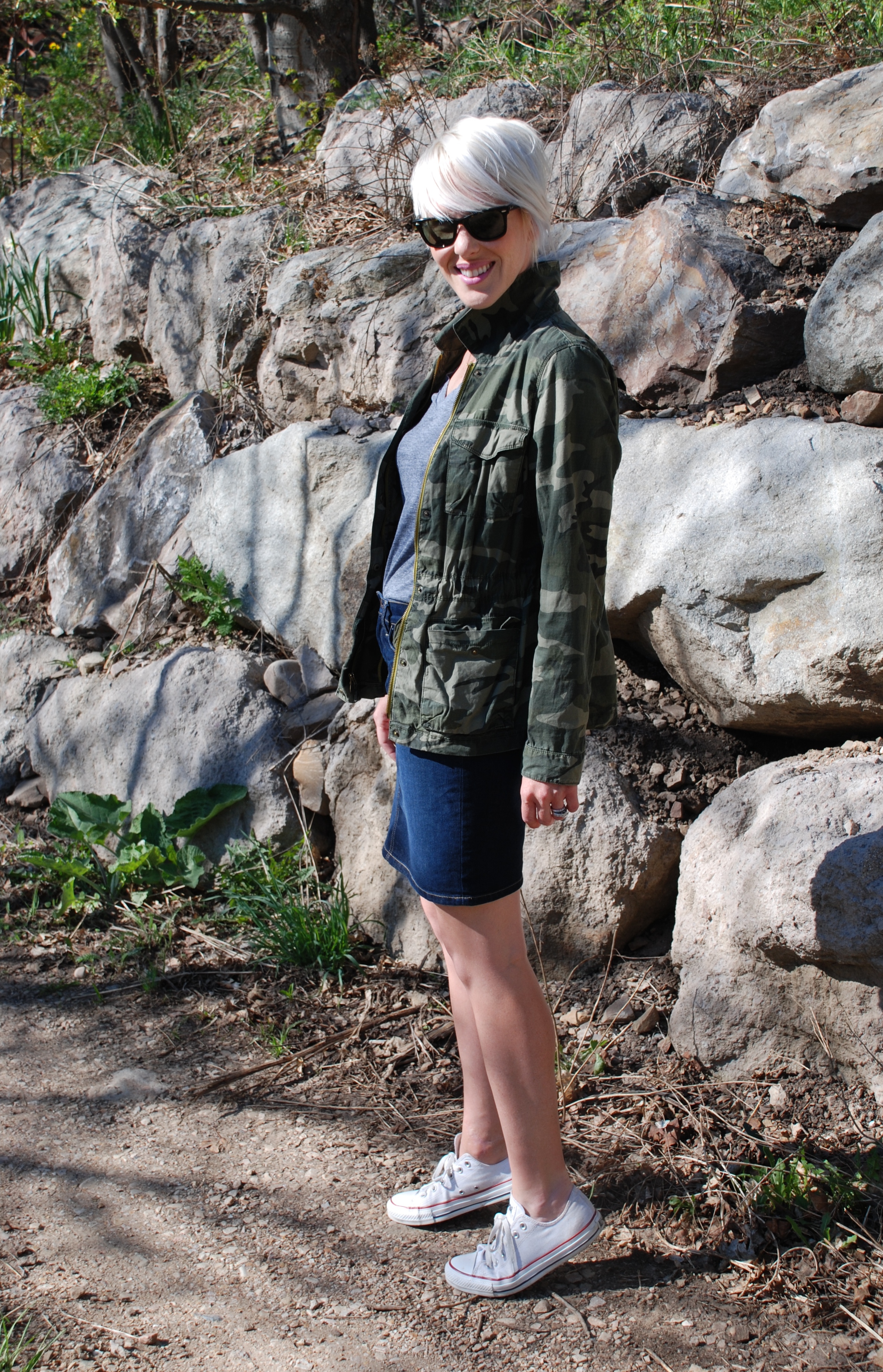 This outfit is just about as standard as they come. Camo jacket, grey tee, jean skirt, converse. CHECK. The reality is, outfits like these are the ones that get me through the everyday. So it may be standard, but this ensemble is just right for REAL LIFE!