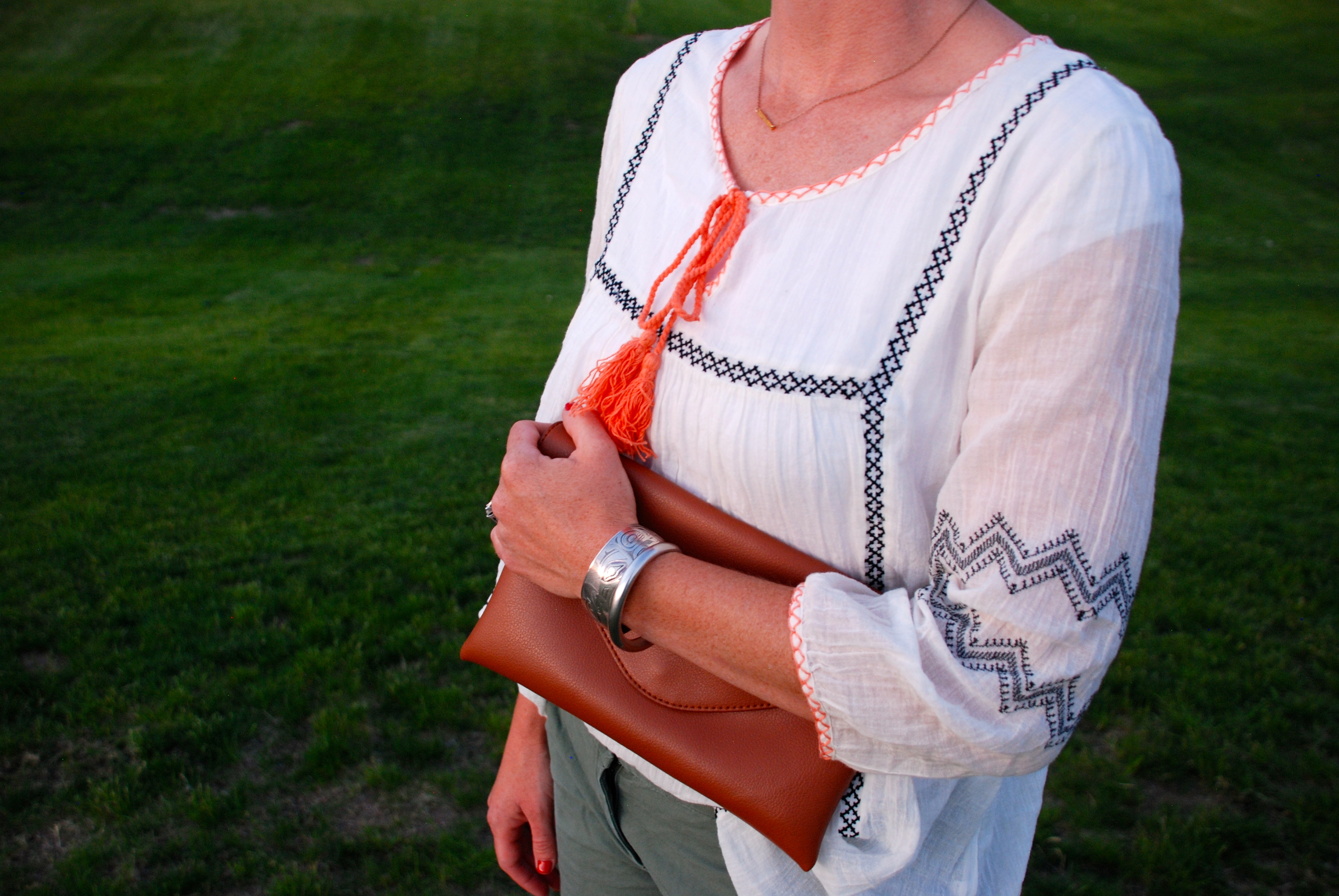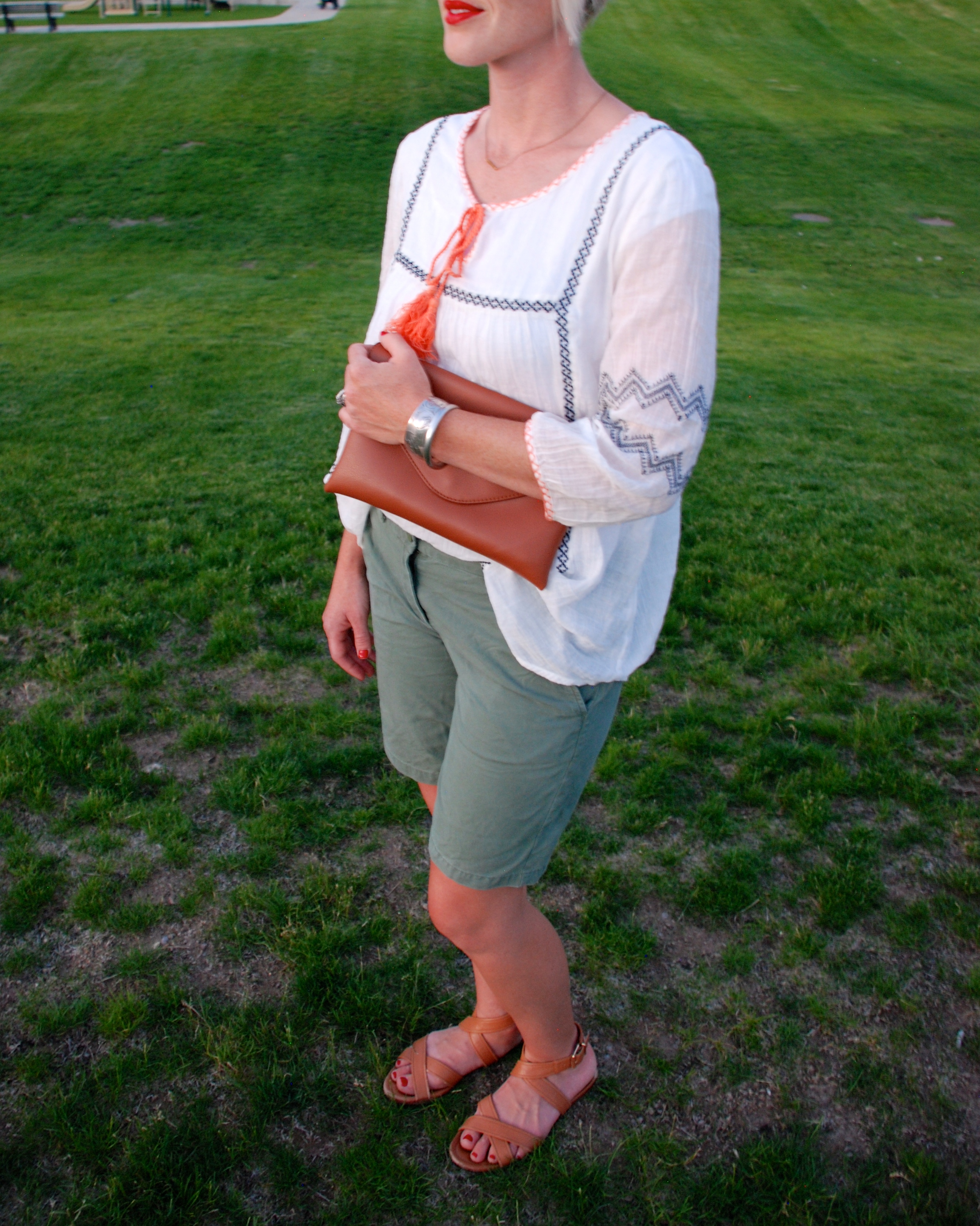 Shirt: World Market (similar), Shorts: Gap, Sandals: J.Crew (similar), Clutch: J.Crew Factory, Bracelets: Vintage, Necklace: Gorjana, Nails: OPI Big Apple Red