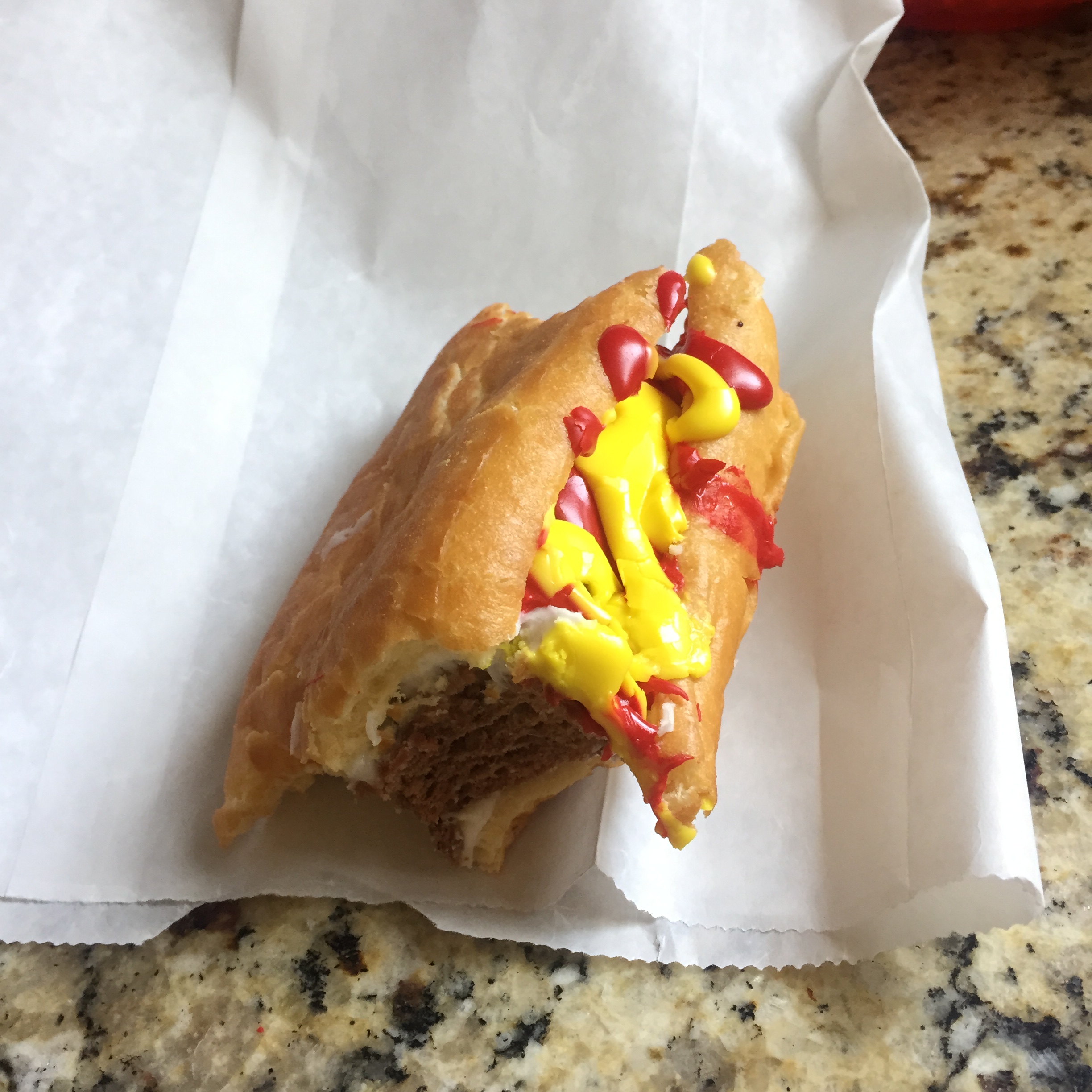 Then I cursed myself for having bitten into the thing without sharing my joy with my friend. It tasted DELICIOUS like a donut, it LOOKED like a hot dog. But I needed to check in with A to see if this hot dog donut was legit, or a shoddy likeness of the REAL DEAL.) I took a picture (the one above, in fact) and texted my friend: