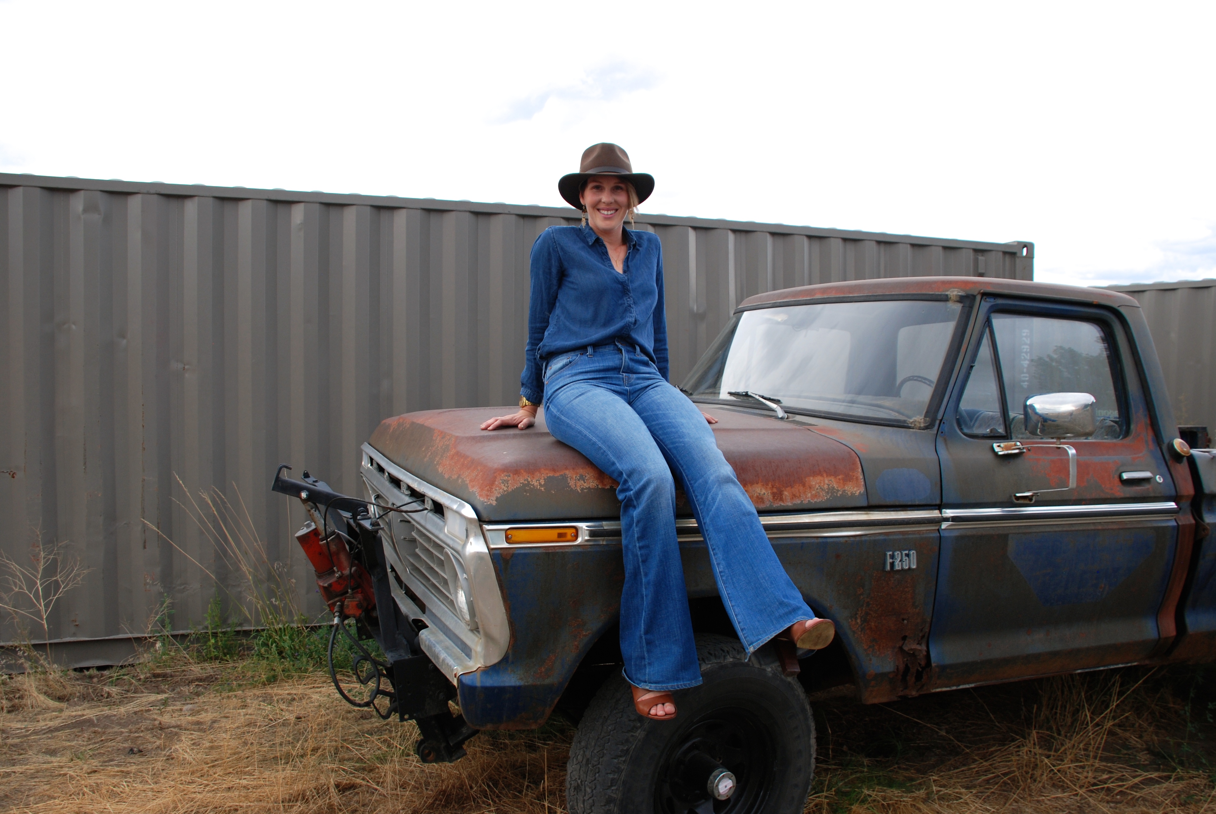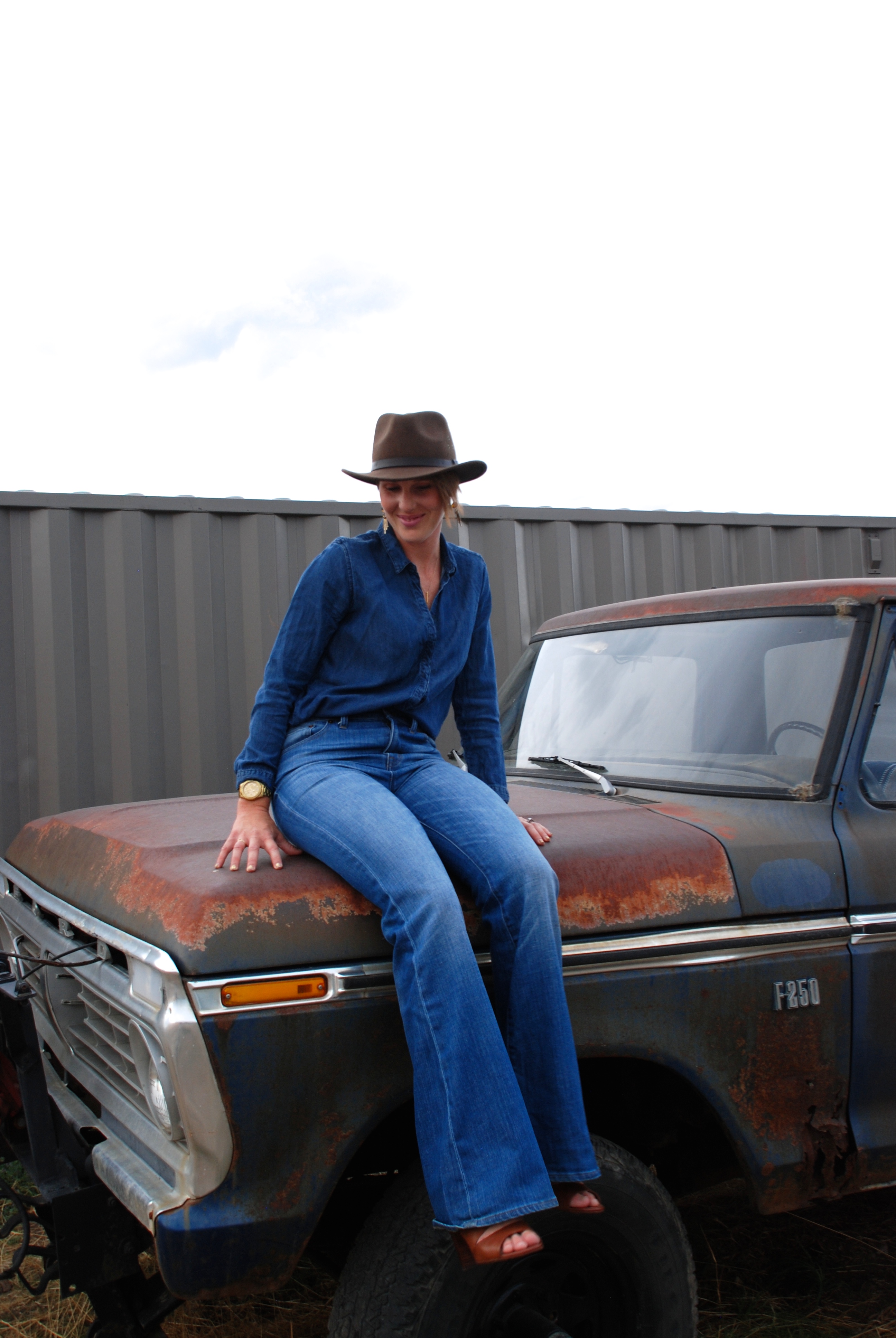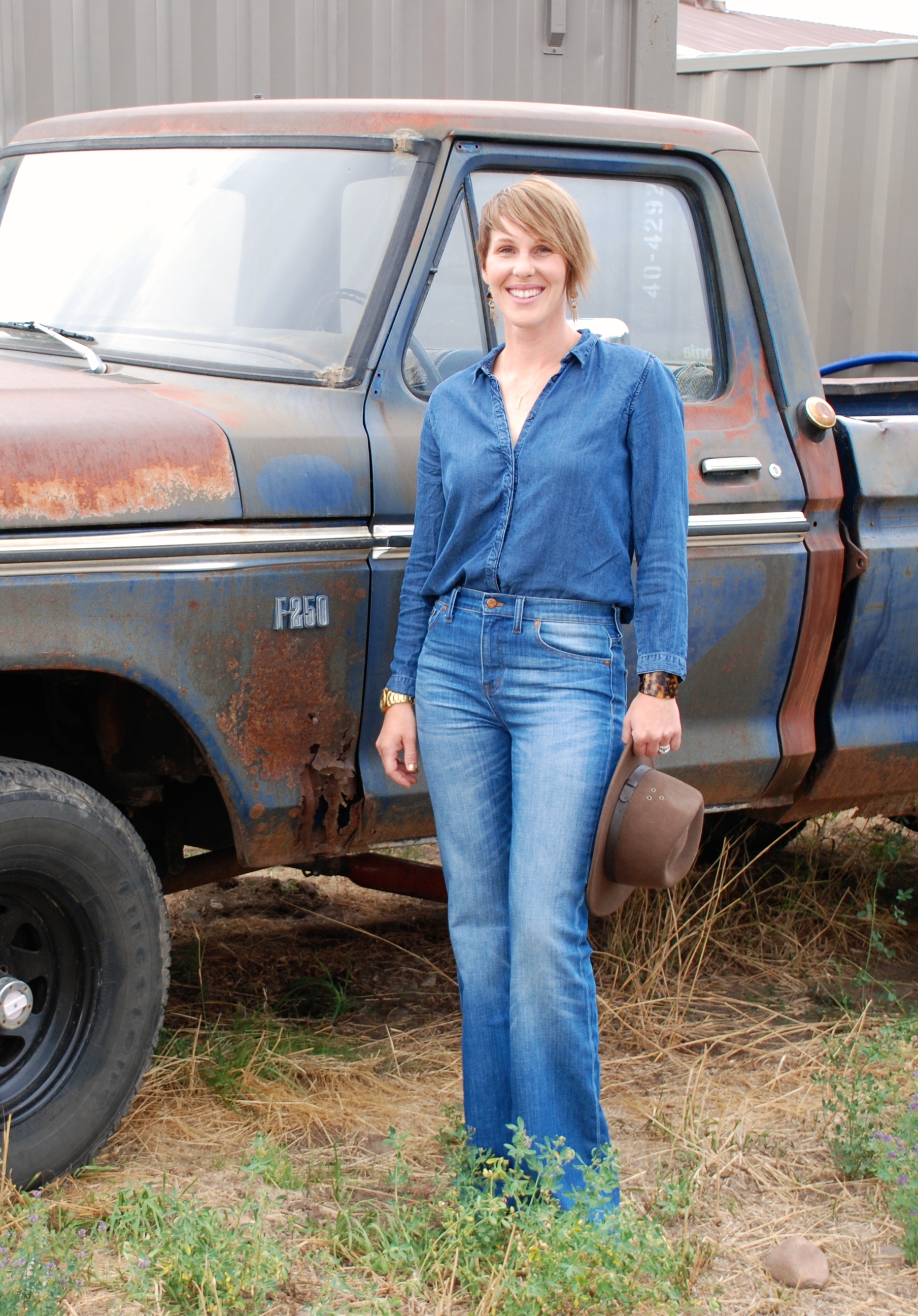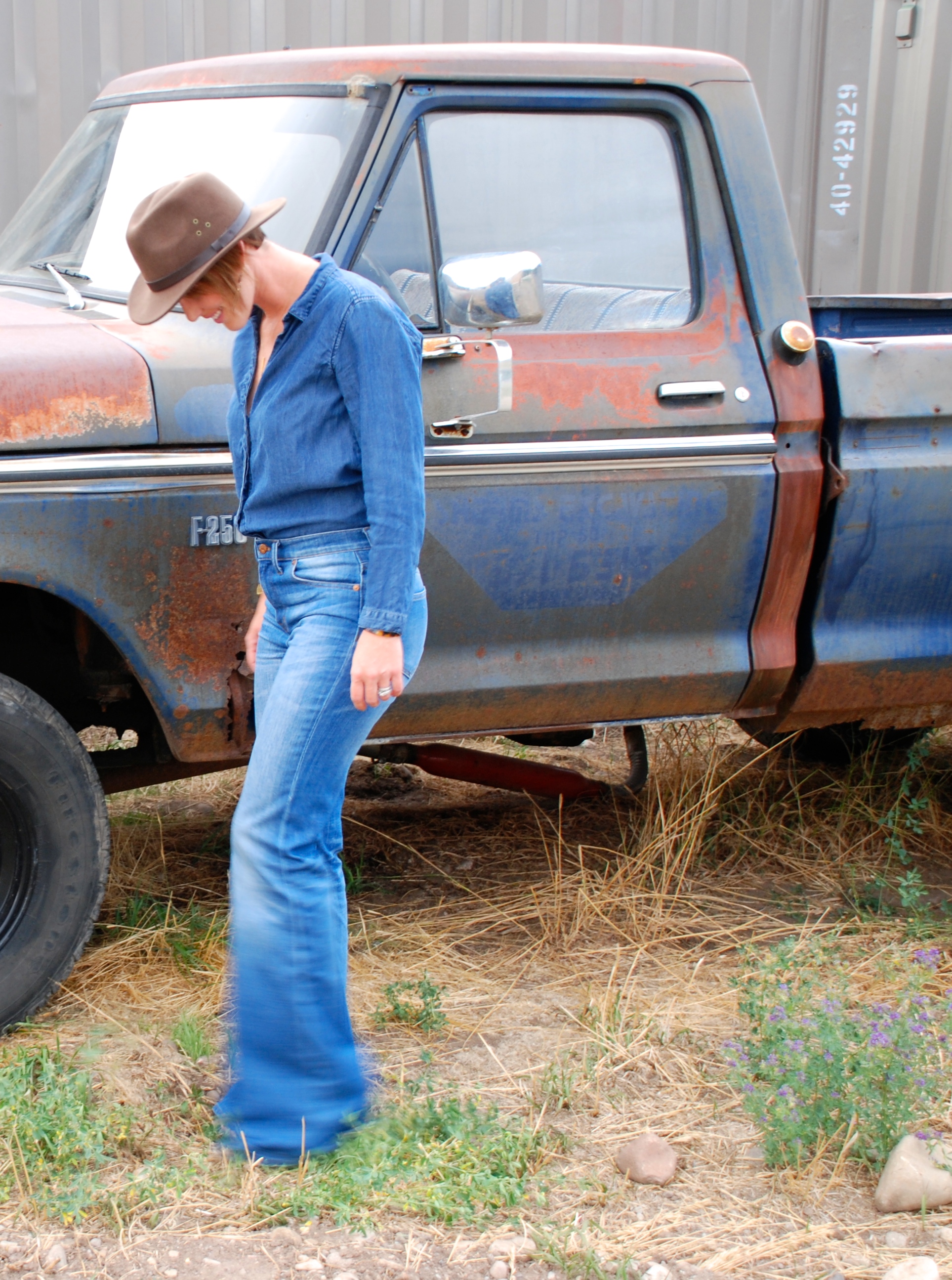 If you take the truck out of it and get back to the outfit, I’m still loving these blue jeans for fall. Good news, they are back in stock in all sizes! Flares that just. don’t. stop. Denim and denim, that’s even better. So here’s to the 70’s, to all denim ensembles, to flares and high waists, to old trucks, and new ways.