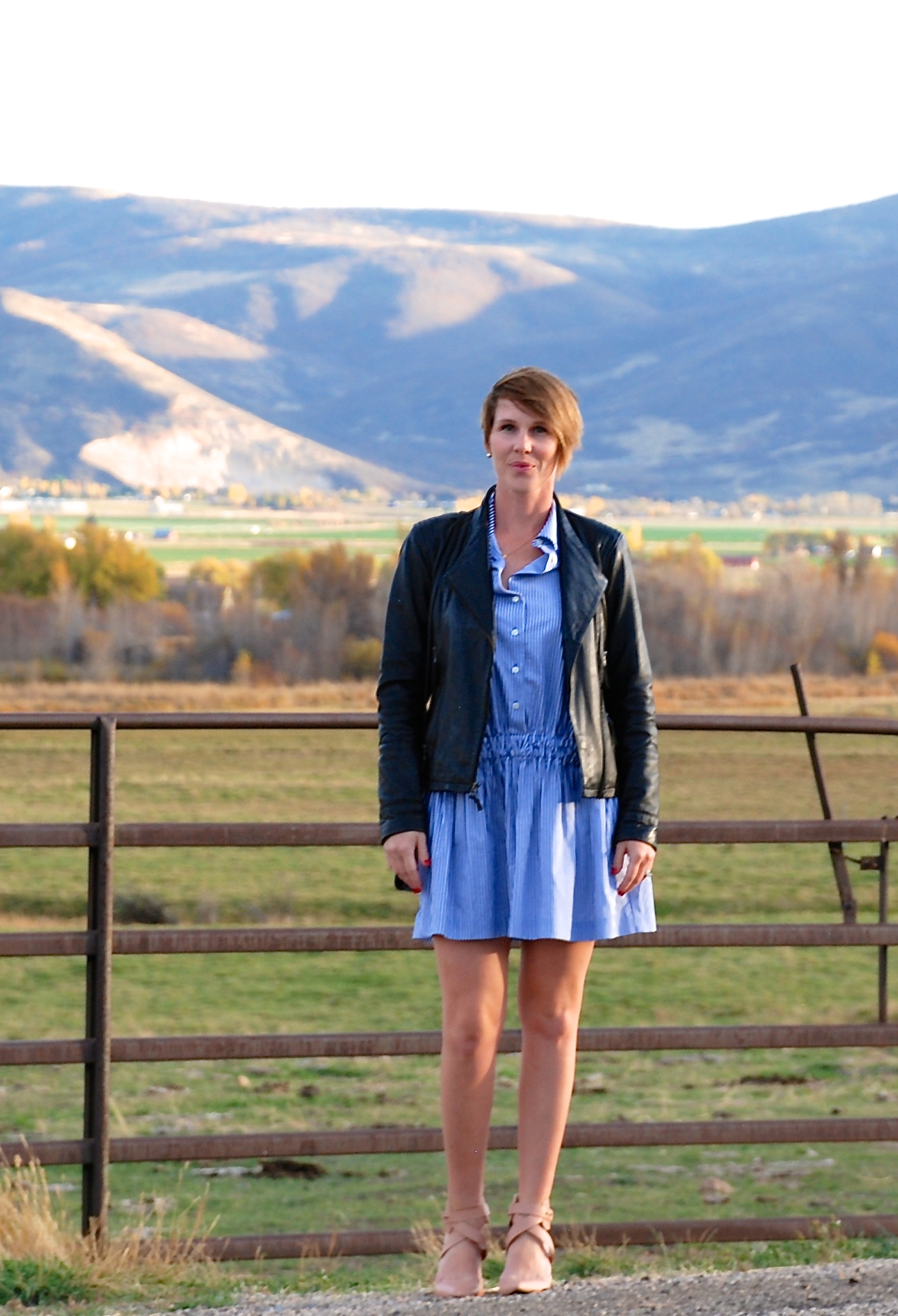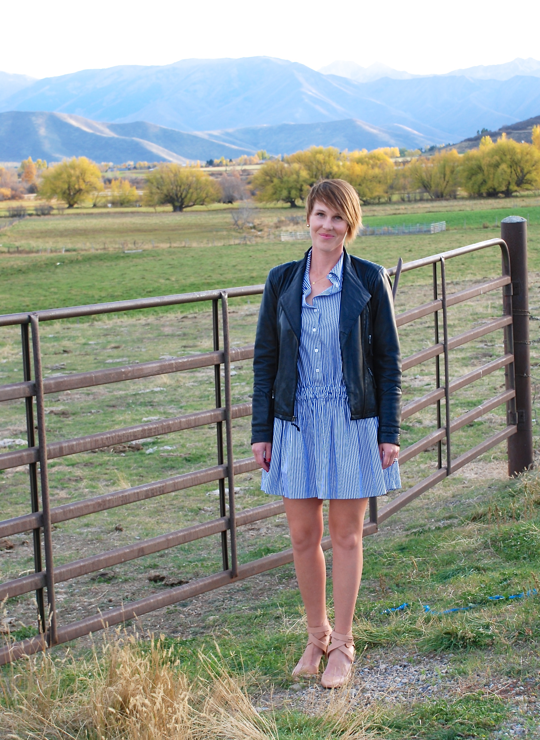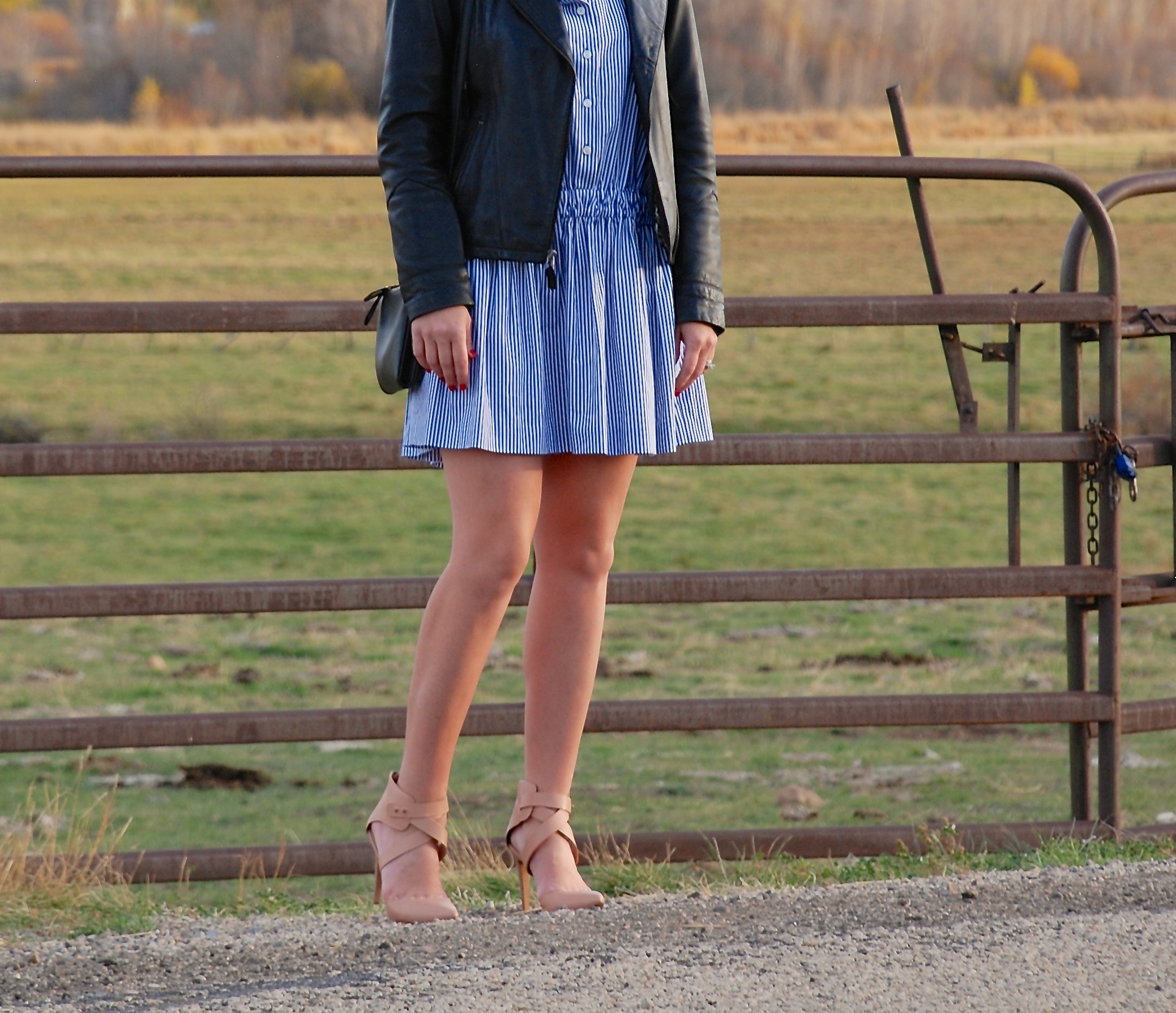 Fall is that golden moment when you can go to your closet, pick out some of your favorites from opposite seasonal leanings– say a black leather jacket, and the perfect striped dress, and your go-to blush heels– and sha-ZAM! throw them together faster than lightning and head out the door for a date with your man in a snap!