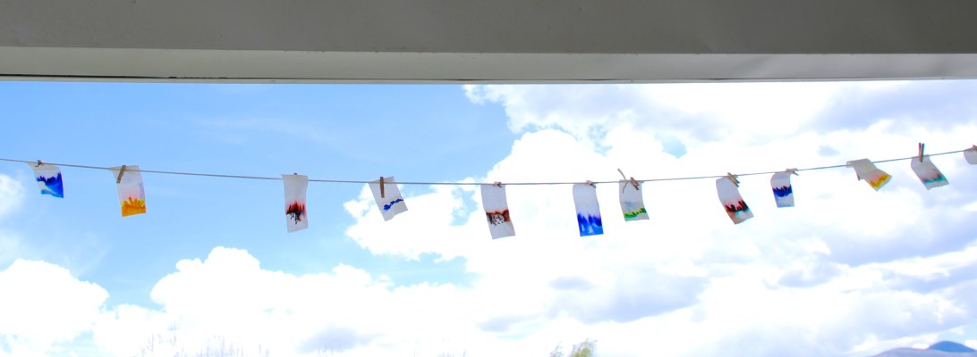 Fifth, we tied our ropes together, and strung them along the porch. The kids helped to carry the pieces of paper over and we carefully attached them with the clothespins to the rope.
