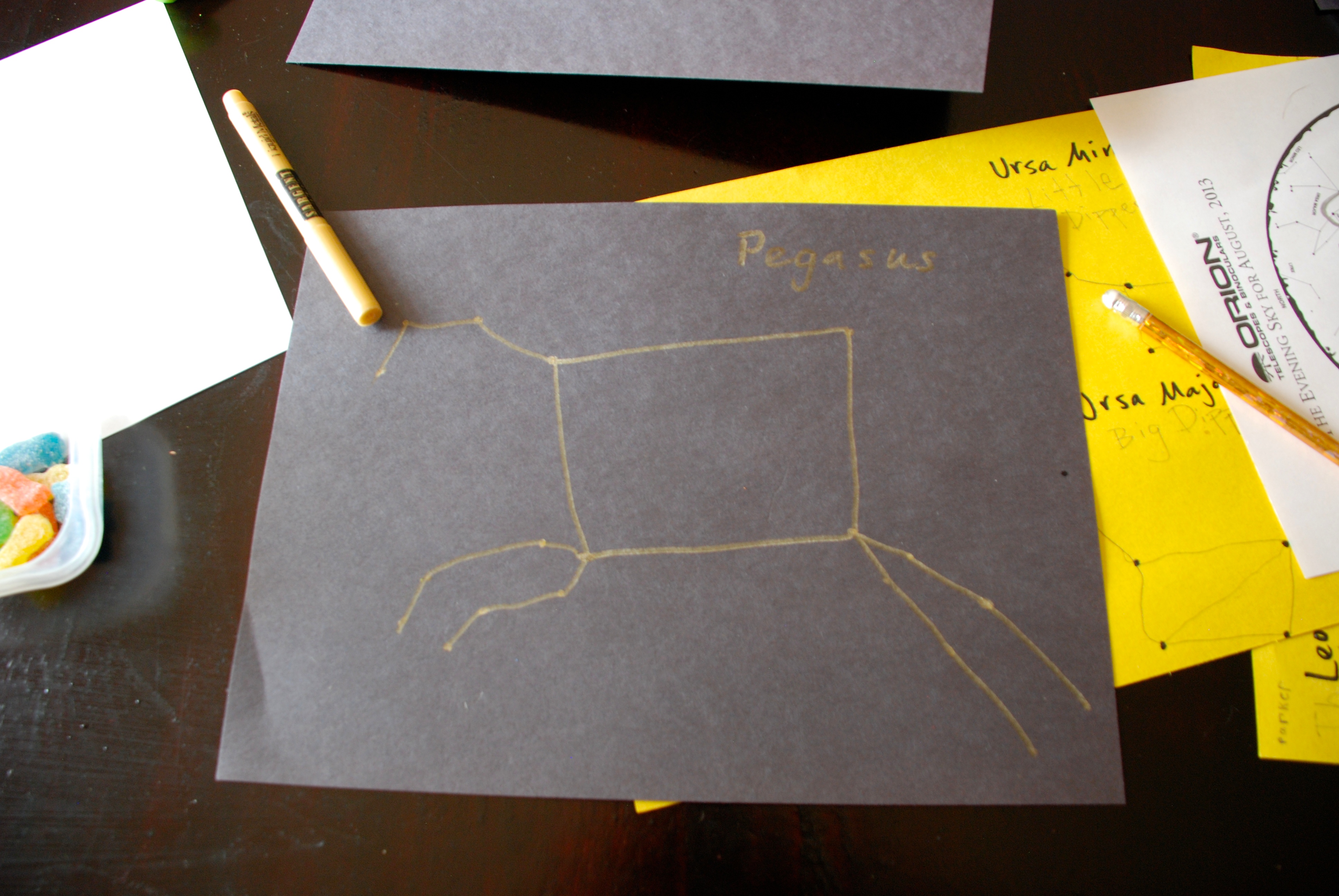 When they were finished circling constellations on their star charts I gave them each a piece of black construction paper and some metallic markers so that they could copy the constellations they found for themselves.