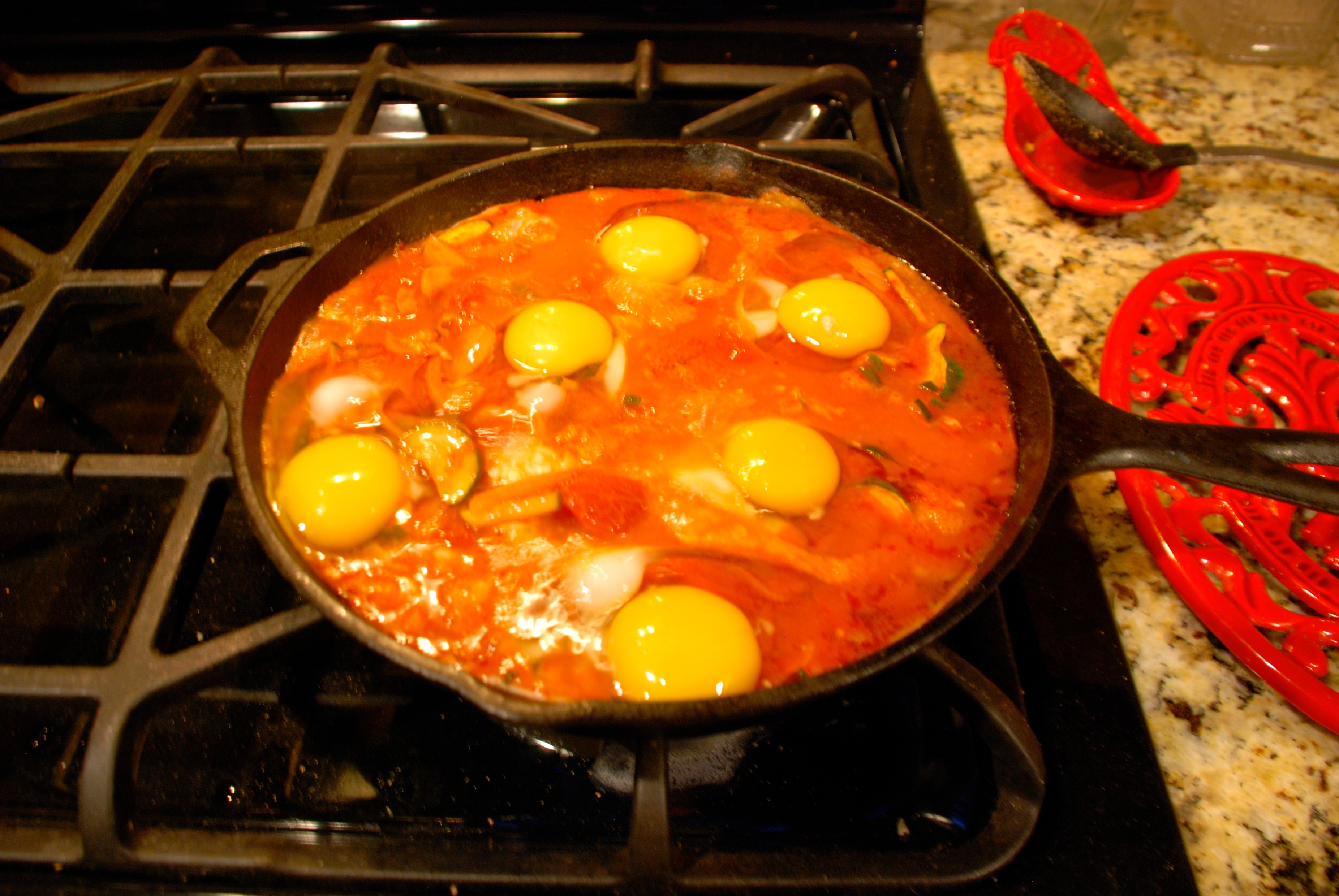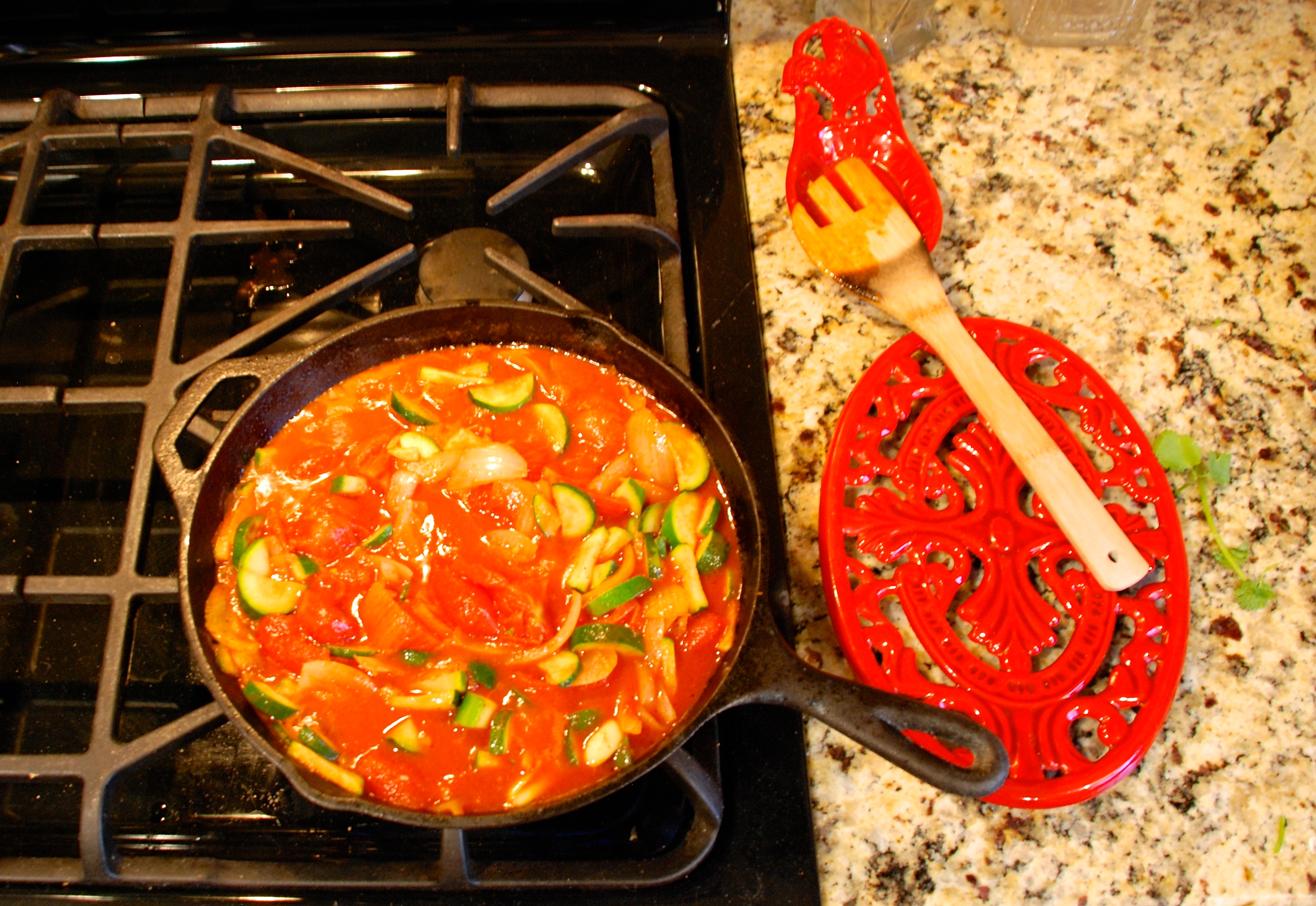 Preheat the oven to 375 degrees. Heat the oil in a large heavy cast iron skillet, over medium heat. Add the onions and zucchini. Sauté for 8 – 10 minutes until they are tender. Add the garlic and cook for 1 minute, then add the cumin, paprika and cayenne, and cook for 1 more minute. Stir in the tomatoes and their juices along with the salt and pepper. Chop the tomatoes with your spoon or with a knife, and simmer until the tomatoes have thickened, about 10 minutes. Stir in the feta.