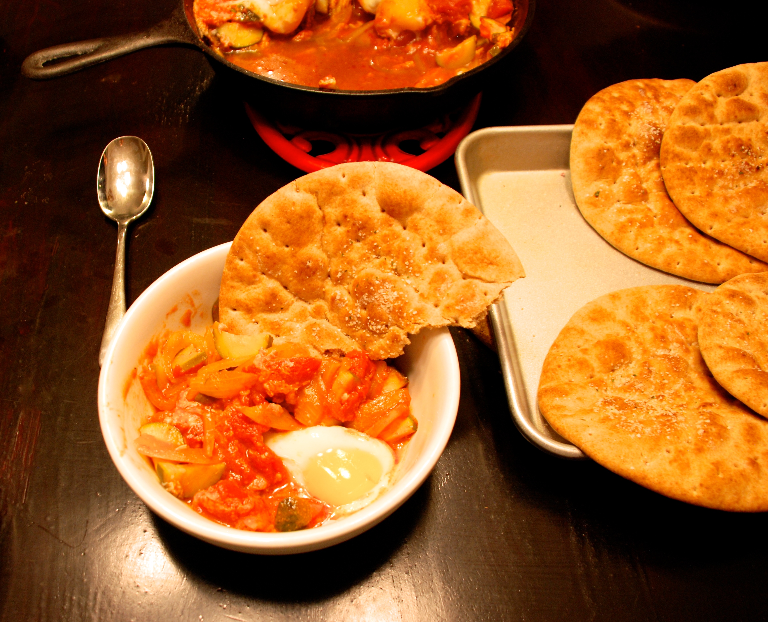 This is the kind of meal I reach for on cold evenings– Love Shack Shakshuka from The Scramble. It is all things comfort– hot, hearty, flavorful, and substantive– without exorbitant calories! I have to admit that it wasn’t a kids’ favorite. But you can’t win them all, and they ate plenty of bites of Shakshuka along with their flatbread.